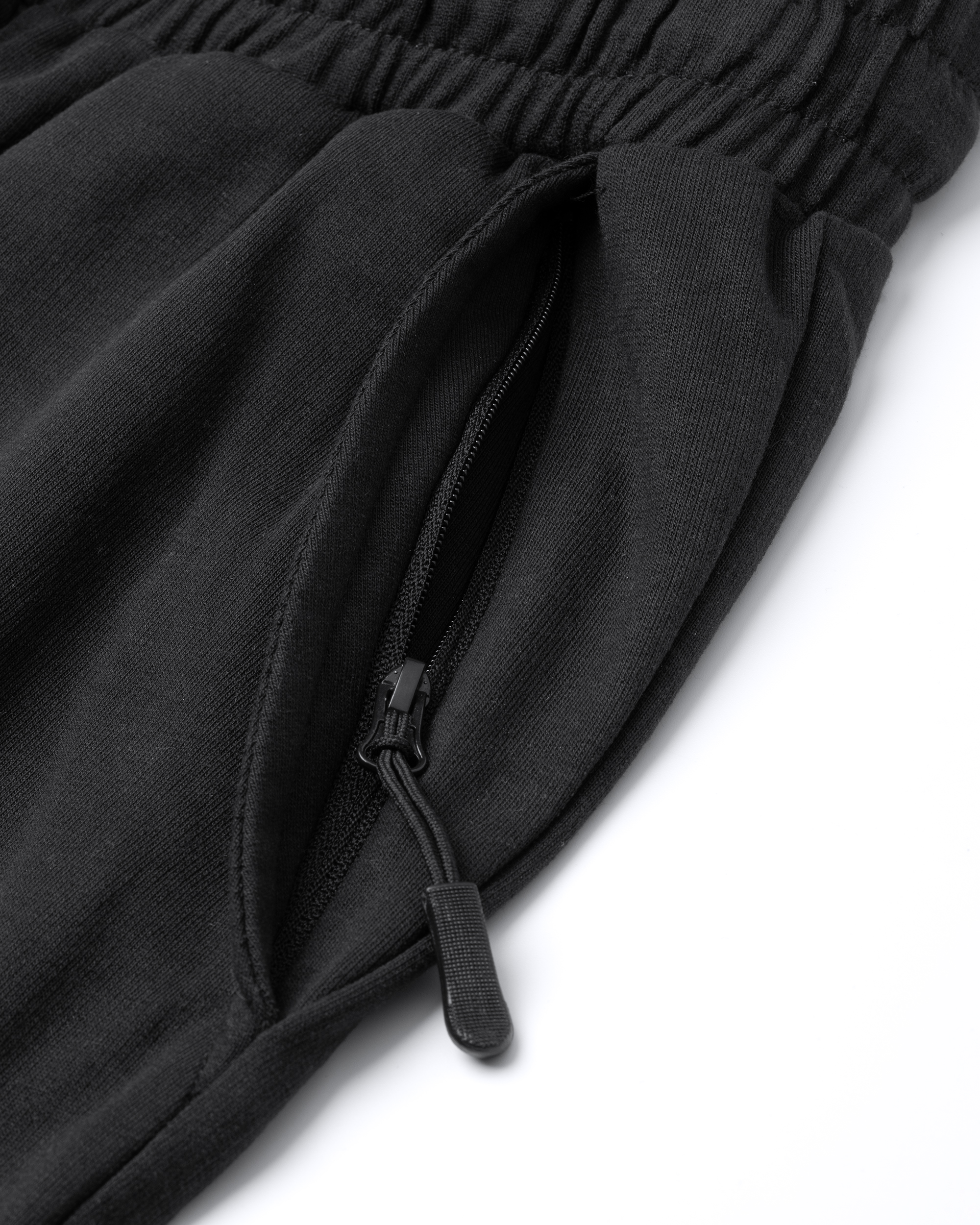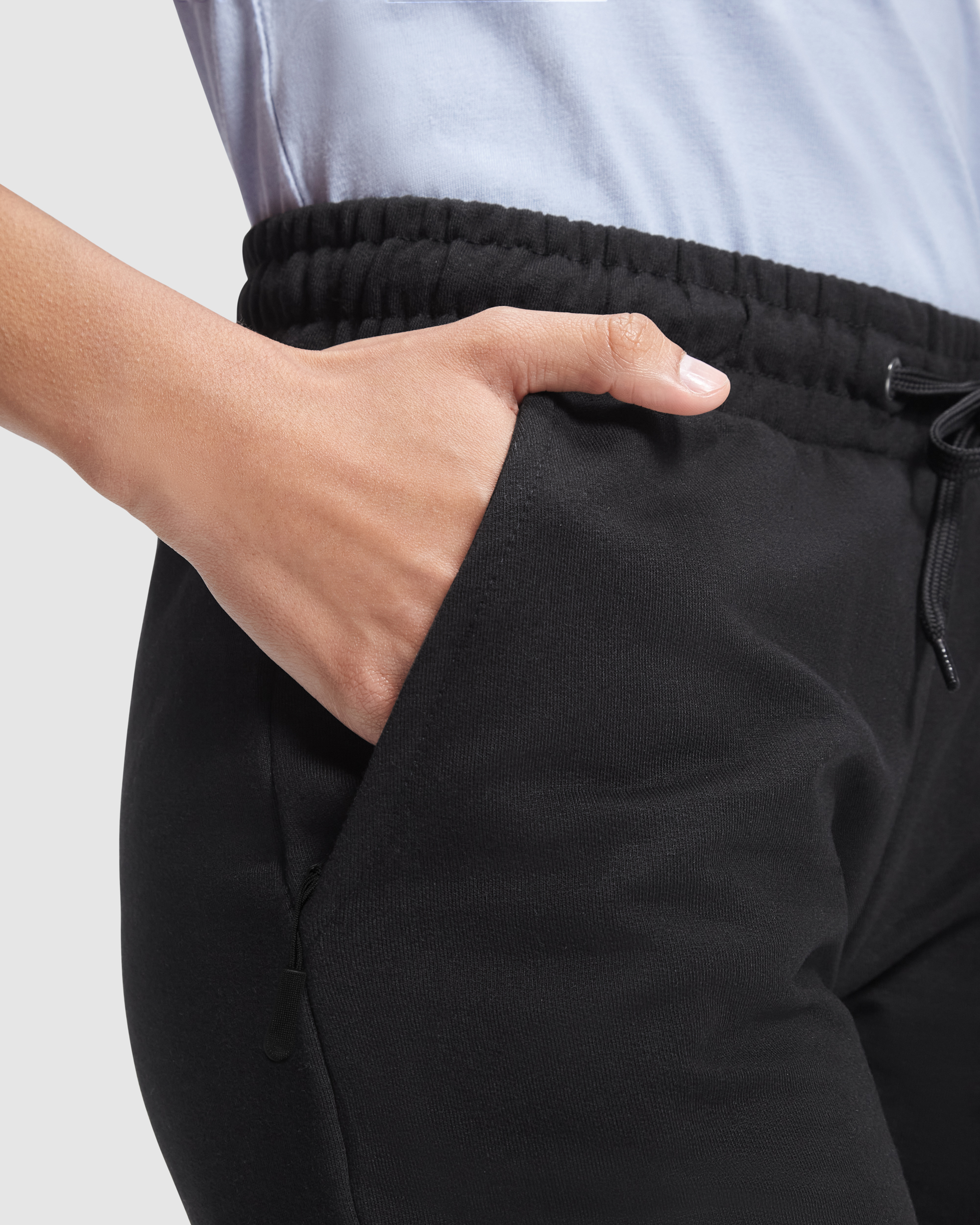 Pantalón largo recto de felpa no perchada básico. Bolsillos laterales con cremallera en talla de adulto. Cinturilla engomada con cordón ajustable y ojales metálicos. Puños en rib 1×1.