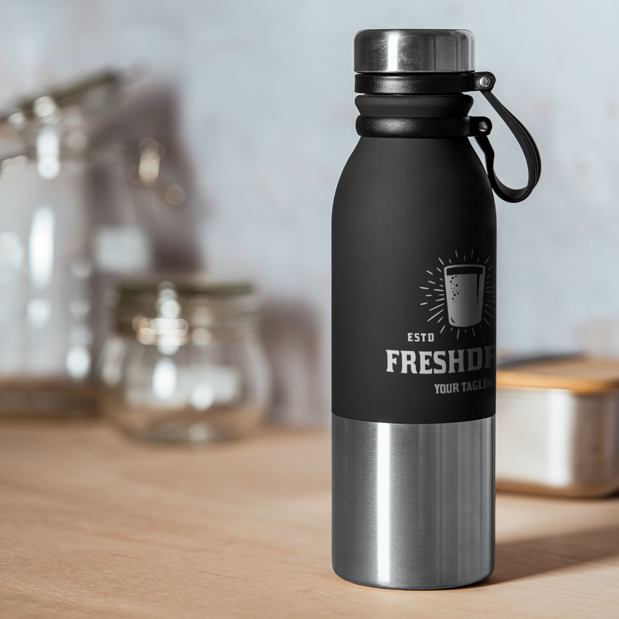 Bidón de acero 304 con cuerpo en 2 tonos y acabado mate. Tapón con asa flexible de goma. Capacidad 850ml. Ideal para crear originales diseños.