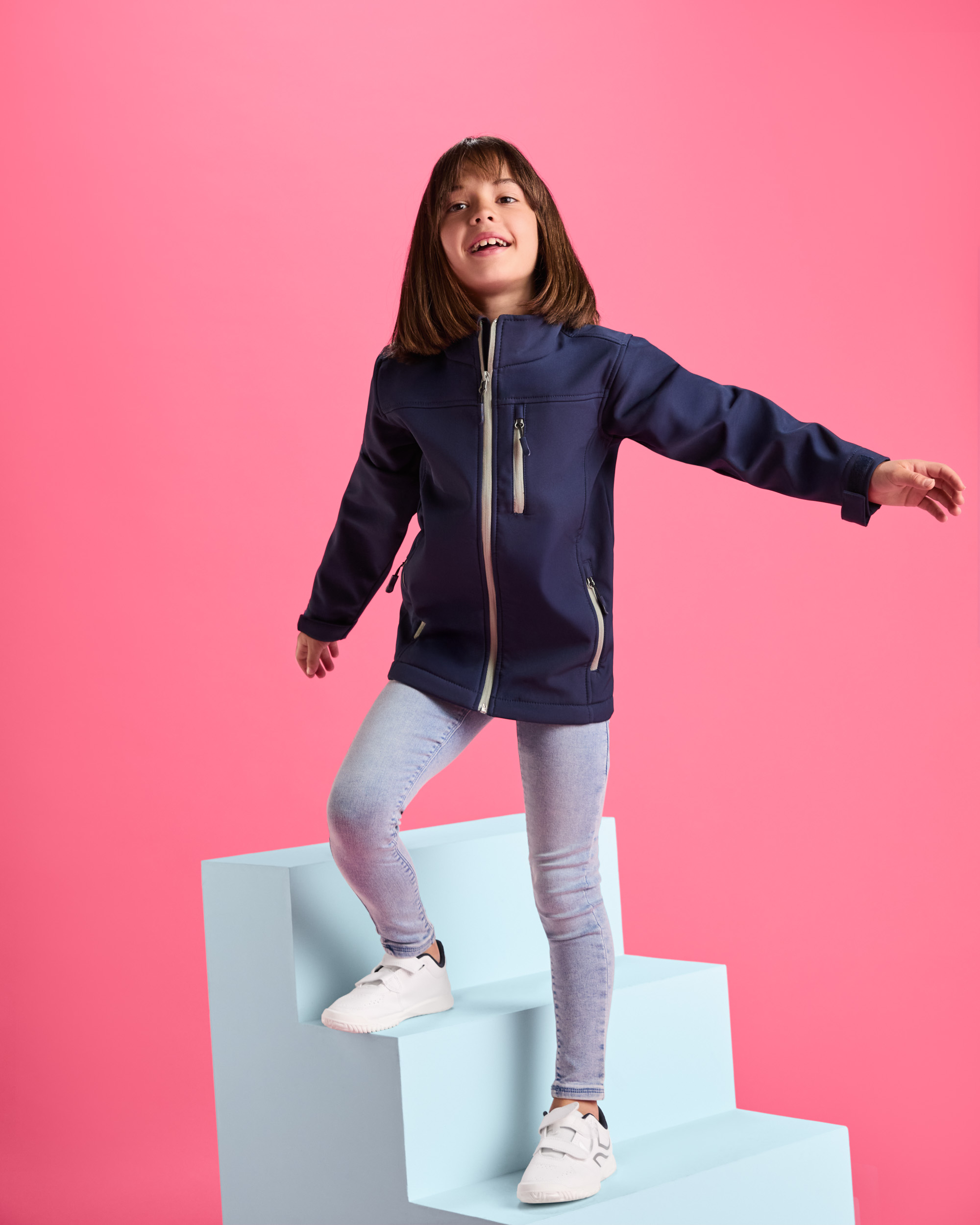 Chaqueta softshell de 2 capas con cremallera frontal invertida a contraste. Interior en tejido micropolar. Dos bolsillos laterales y uno en pecho izquierdo con cremalleras invertidas a contraste. Protector de barbilla del mismo tejido invertido. Ajustadores laterales en el interior en tallas de adulto.