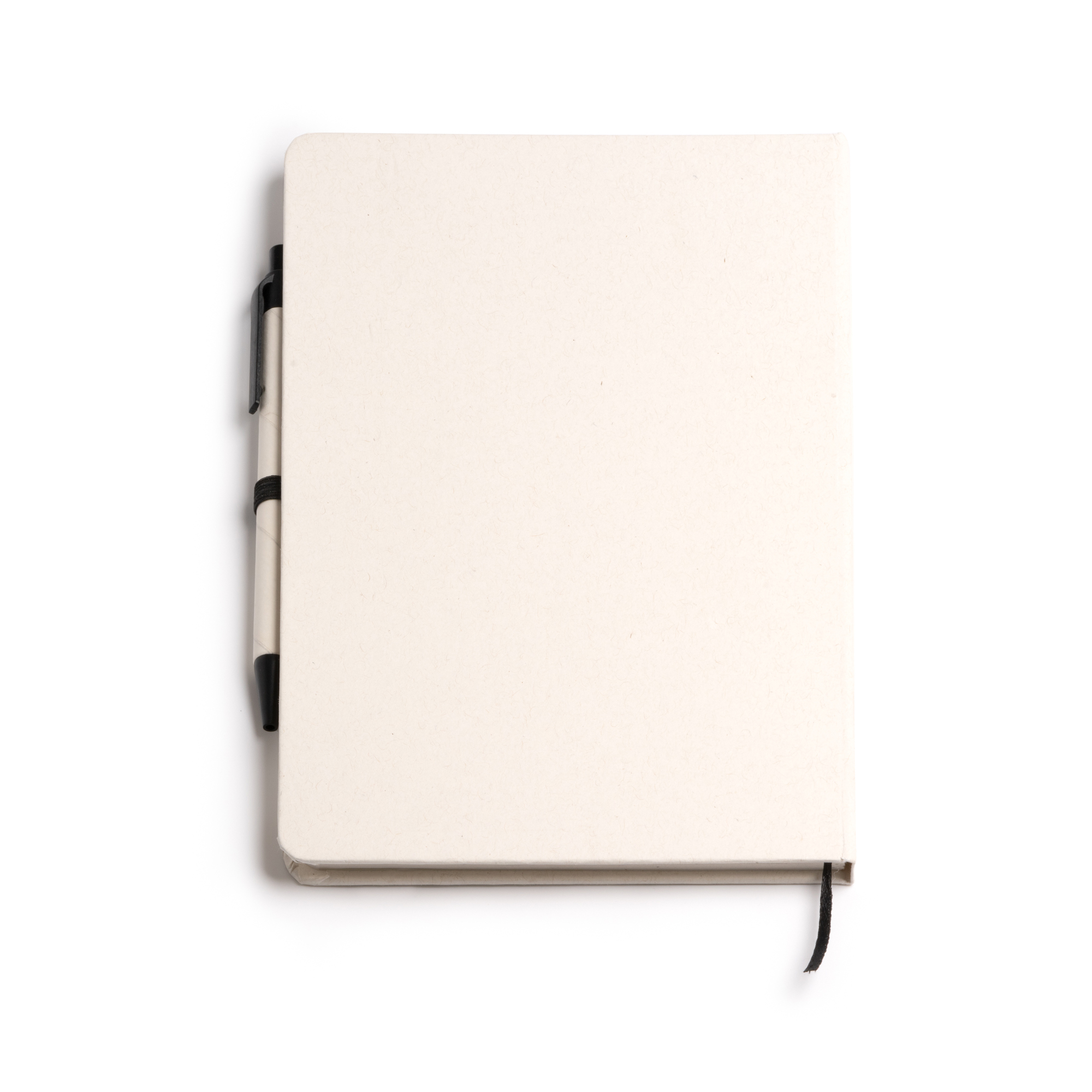 Bloc de notas A5 realizado en cartón reciclado de briks de leche. Tapa rígida con banda elástica y marca páginas. Incluye bolígrafo de tinta azul. 100 hojas lisas.