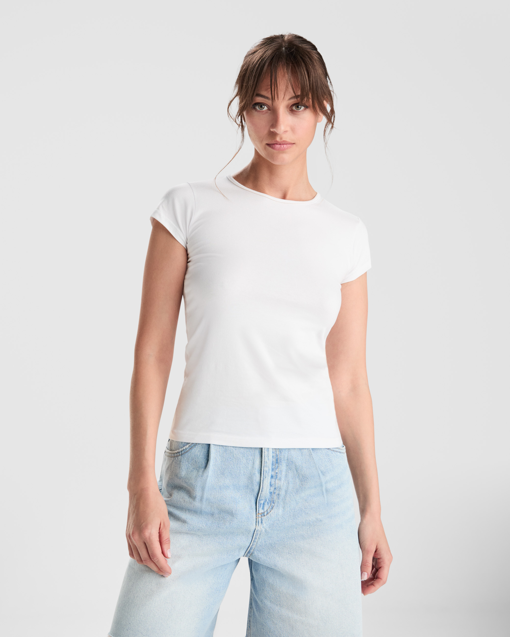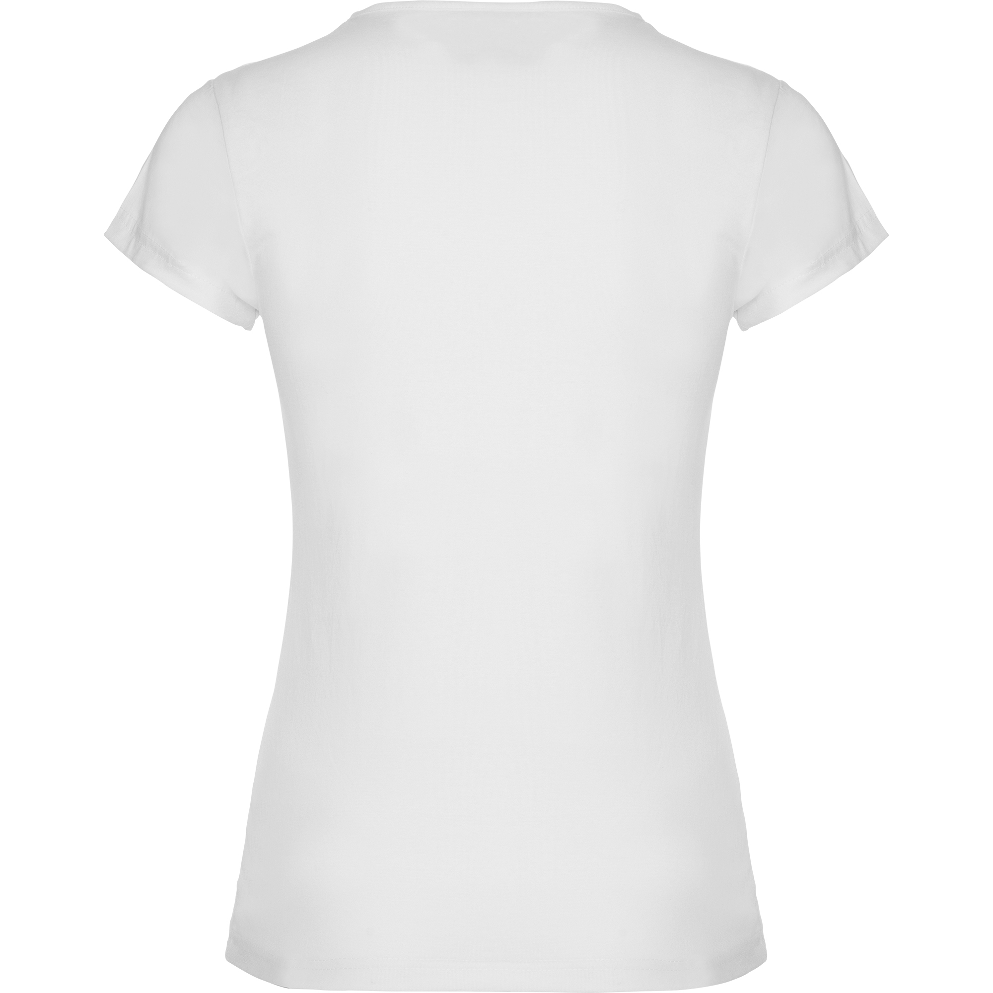 Camiseta de manga corta con elastano entallada en cintura. Cuello redondo con ribete al tono del mismo tejido.