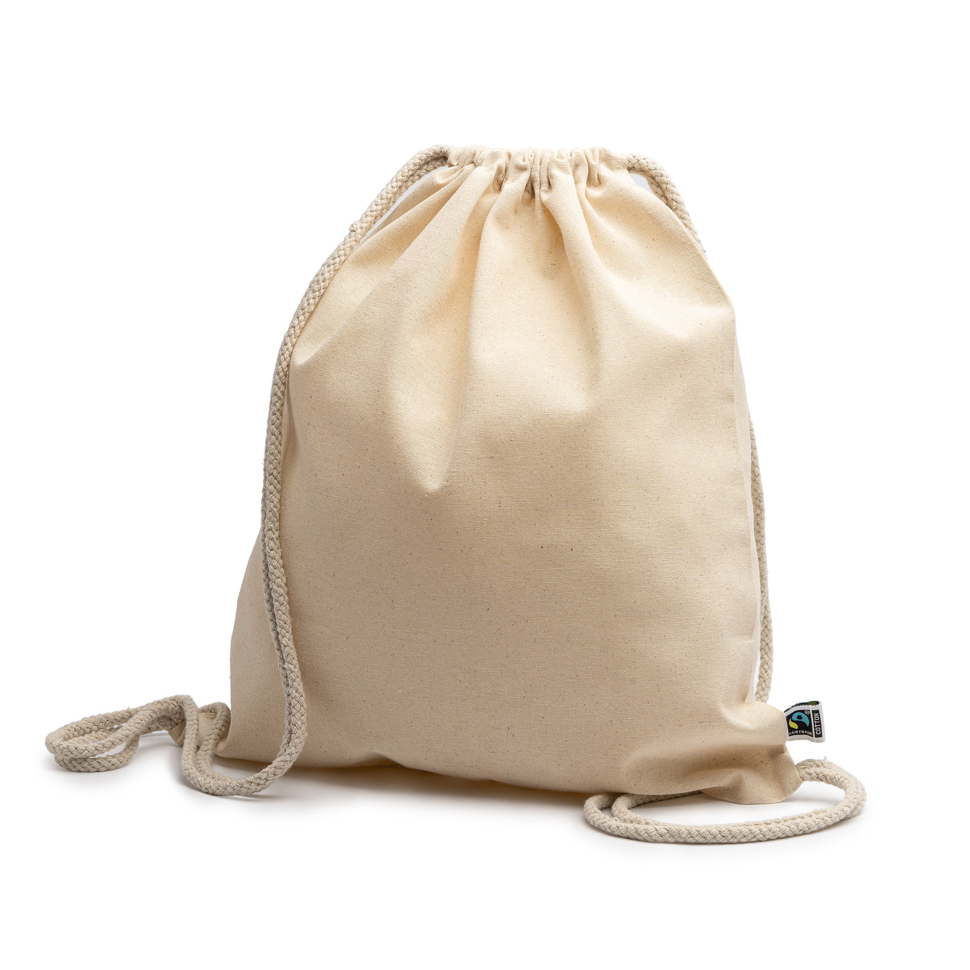 Mochila de cordones 100% algodón Fairtrade de 180 g/m² en color natural y cordones en el mismo color. Idónea mochila para uso diario.