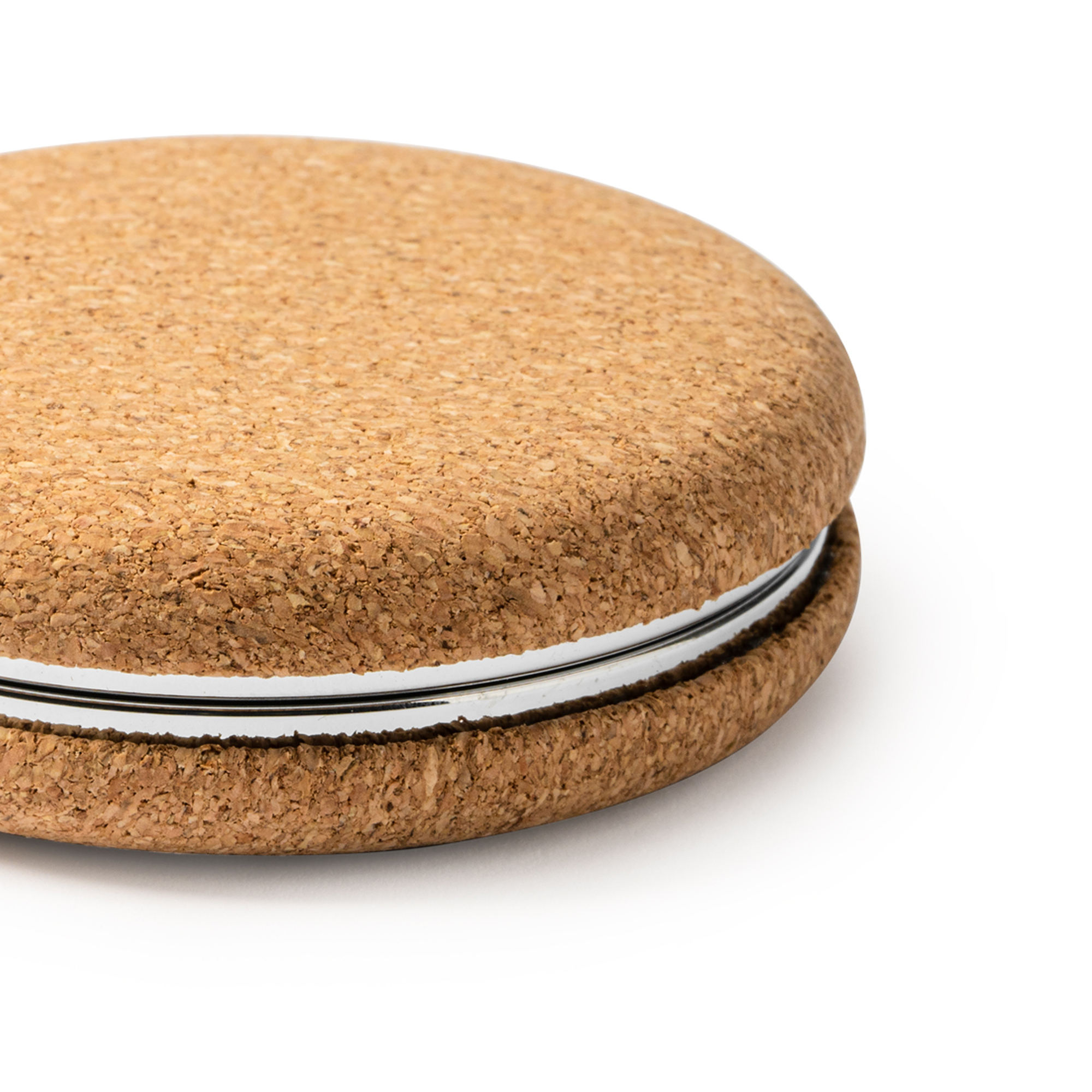 Espejo plegable de bolsillo en forma circular realizado en corcho natural y con detalles en metal cromado, una opción elegante y sostenible. Está compuesto por dos espejos, uno normal y otro de aumento que brinda una imagen más ampliada para detalles más precisos. Una opción versátil y práctica para su uso.