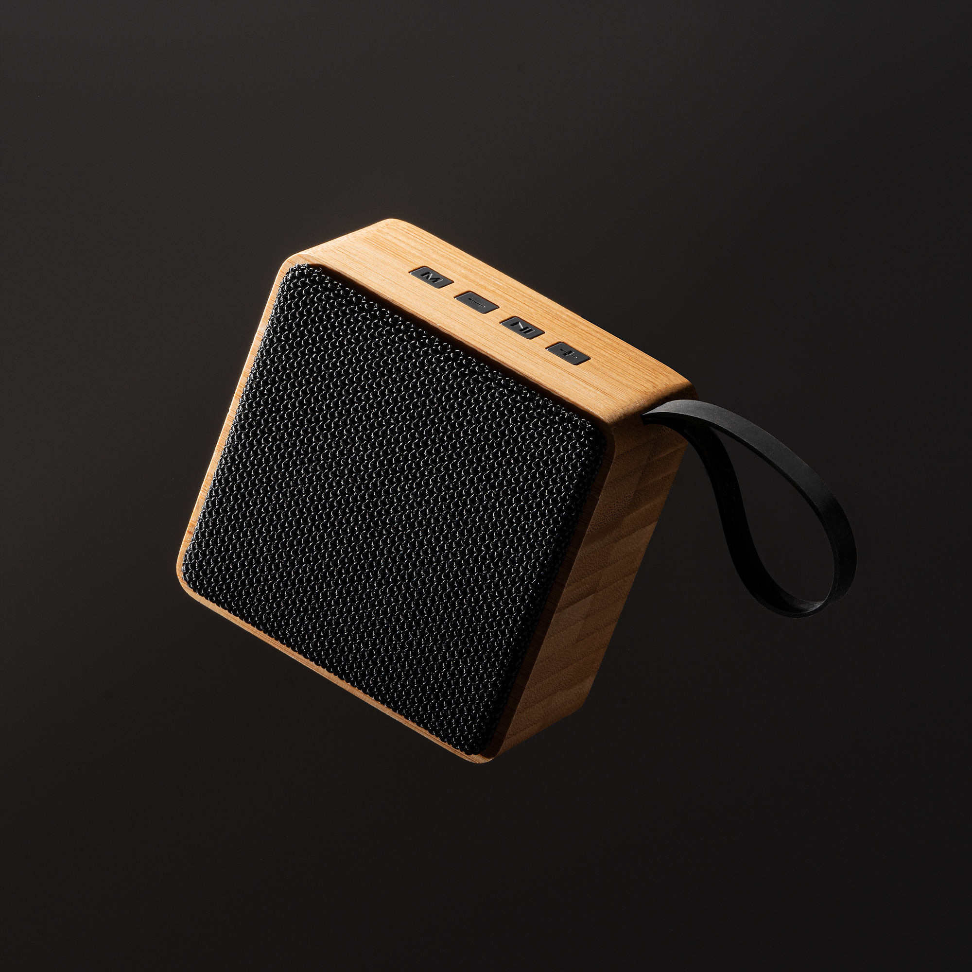 Altavoz inalámbrico con cuerpo de bambú y tejido R-PET. Con 3W de potencia y batería de litio recargable. Cuenta con indicador luminoso de conexión y encendido. Además de asa de agarre y cuatro botones de control. Función de manos libres y control de llamada y entrada de audio USB y tarjeta MicroSD. Puerto Tipo C para carga, cable incluido.