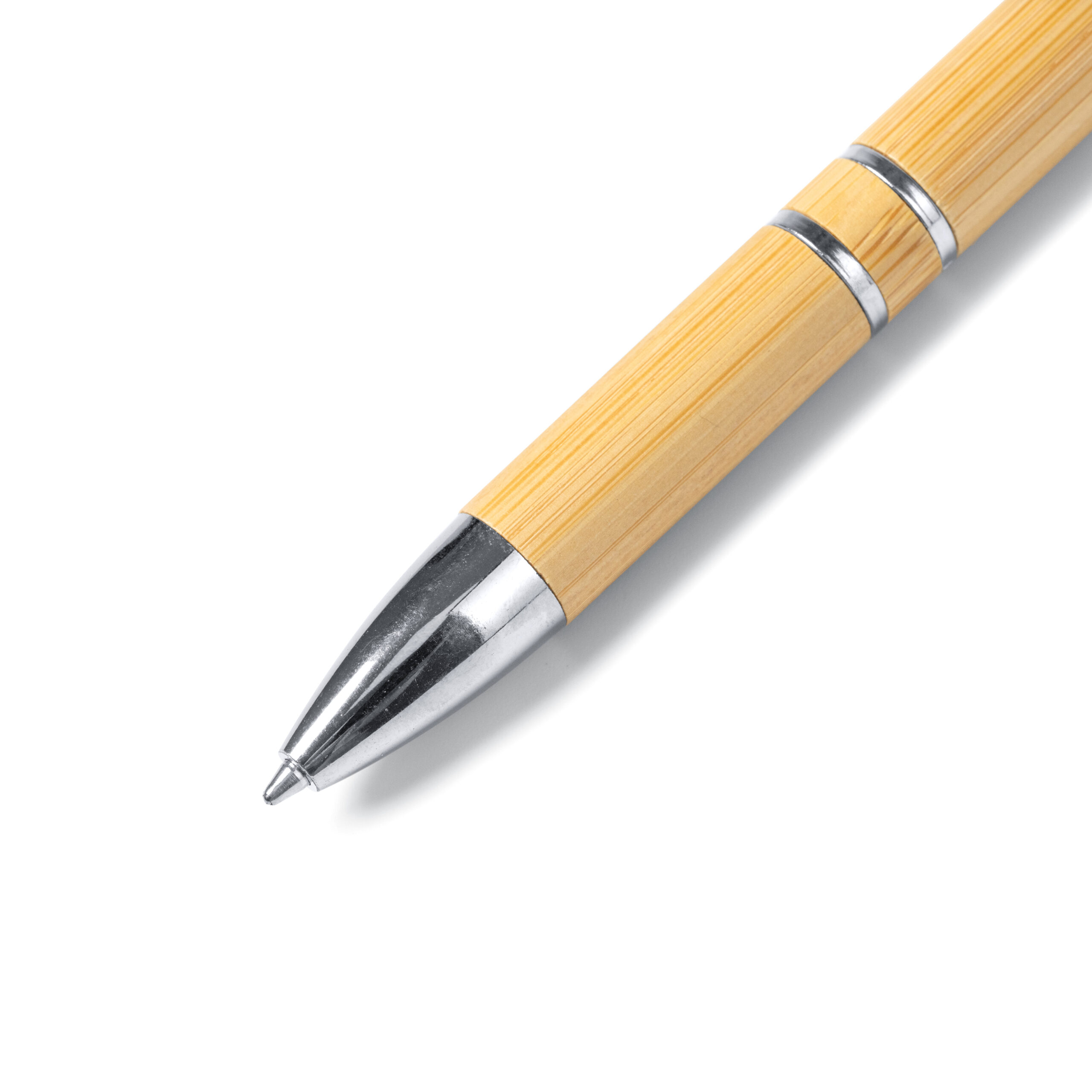 Bolígrafo con cuerpo de bambú y pulsador y detalles en acabado metalizado. Carga jumbo de tinta azul.