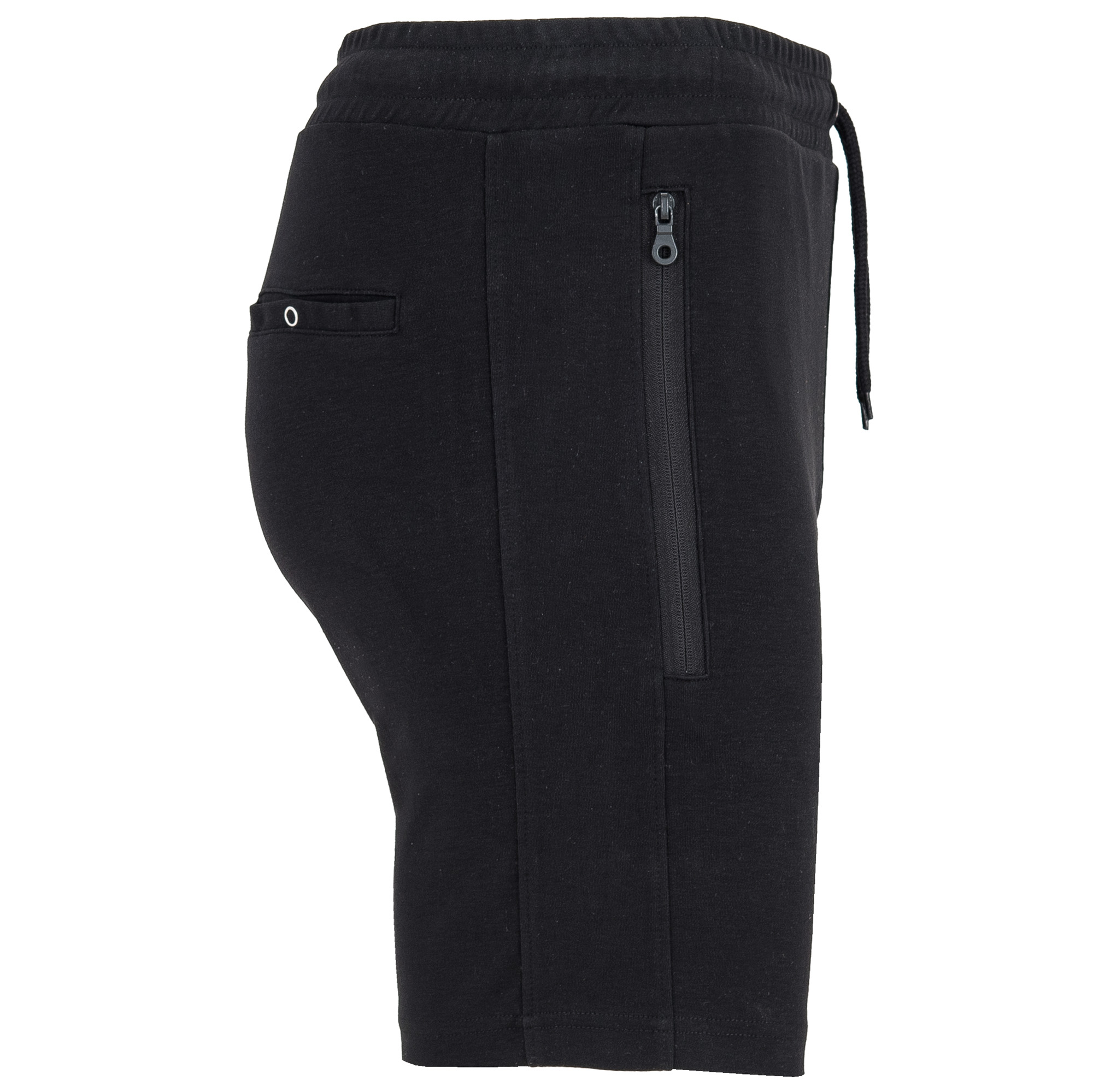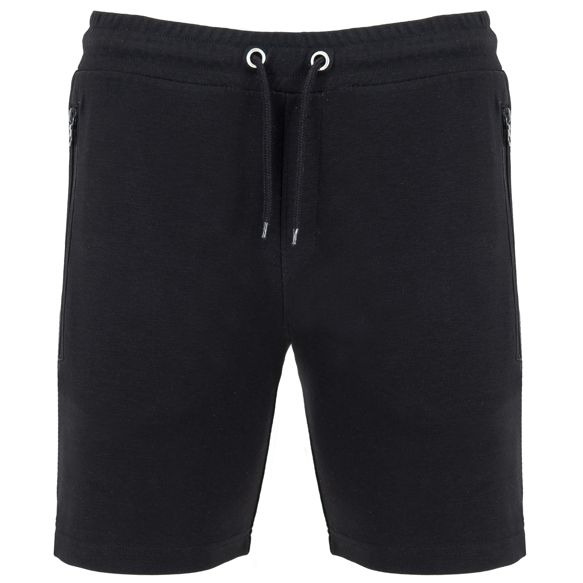 Pantalón corto deportivo interlock. Cintura engomada y cordón ajustable con ojales metálicos. Amplios bolsillos laterales con cremalleras invertidas al tono. Bolsillo trasero con botón a presión. Doble costura en bajo.