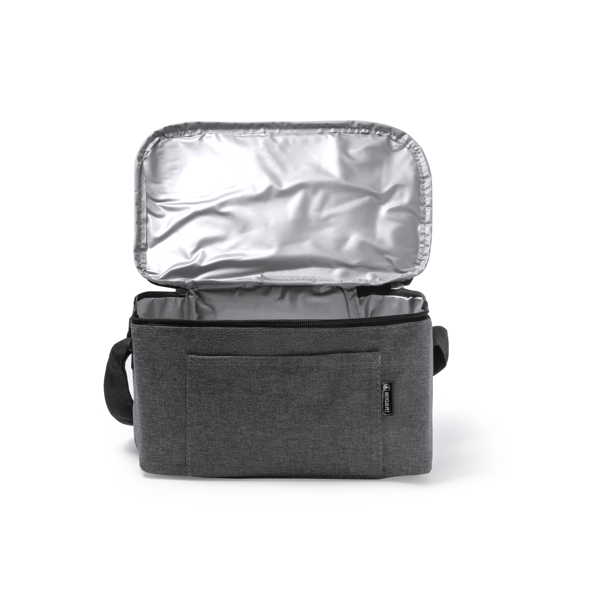 Nevera de poliéster reciclado RPET con diseño vigoré, una opción perfecta para el transporte de alimentos y bebidas combinando funcionalidad y sostenibilidad. Con un bolsillo frontal para el transporte de objetos de menor tamaño, e interior isotérmico, para mantener en perfecto estado tu comida o bebida y llevarla donde quieras. Cuenta, además, con cinta ajustable para mayor comodidad en su transporte.