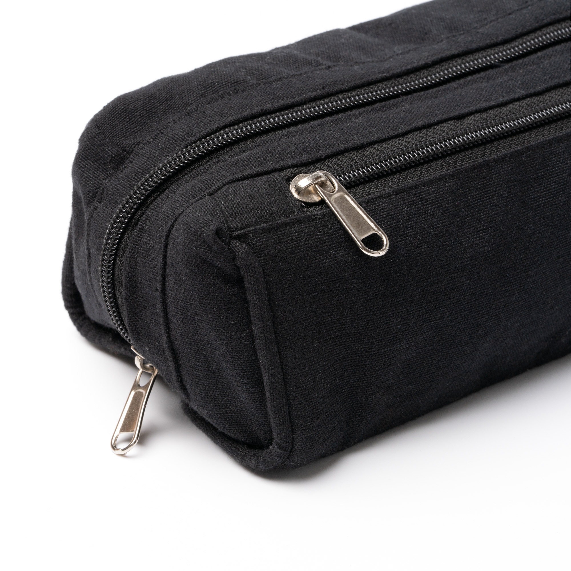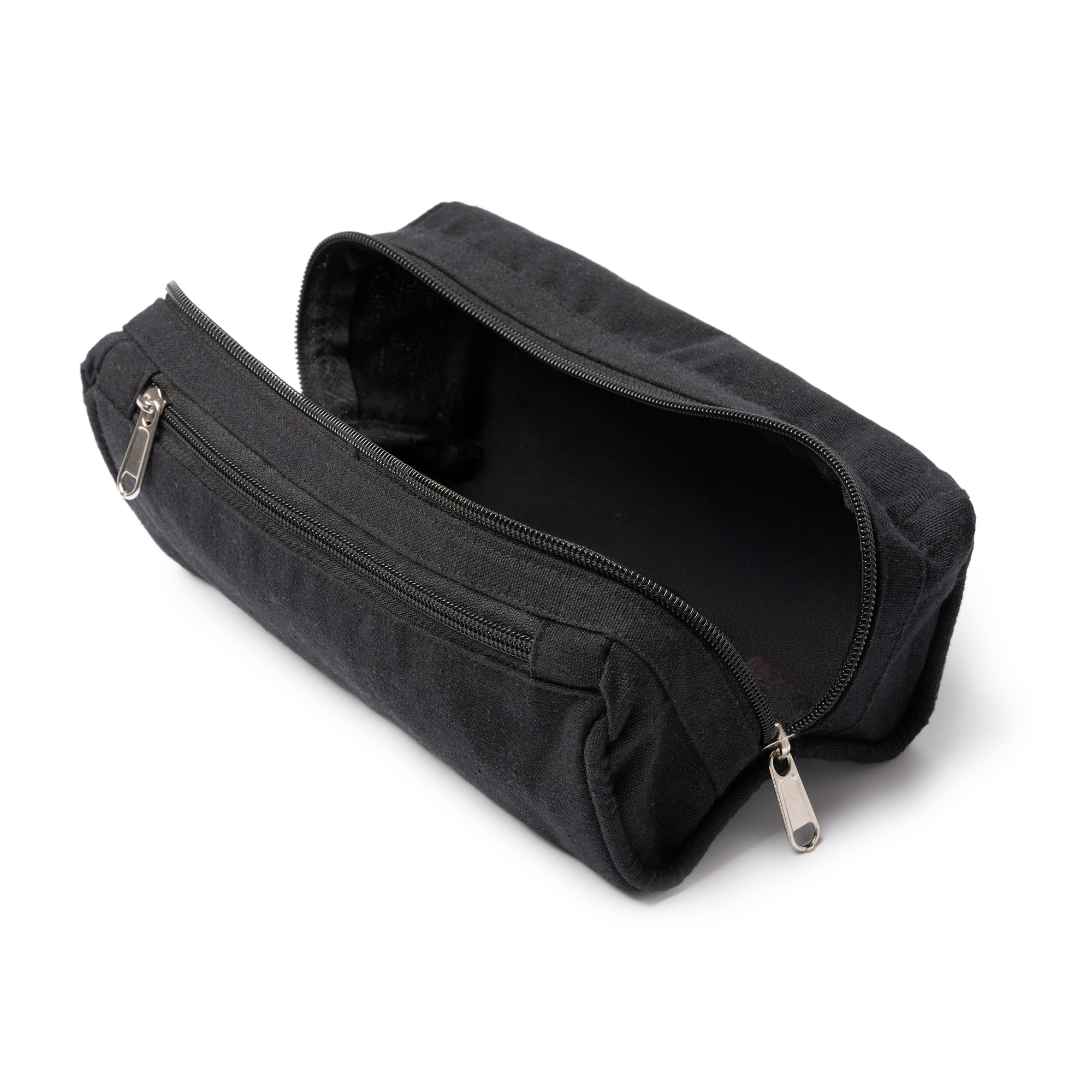 Neceser de algodón reciclado 300g/m² con un compartimento principal y bolsillo exterior para enseres de menor tamaño, ambos con tiradores metálicos y cierre de cremallera.