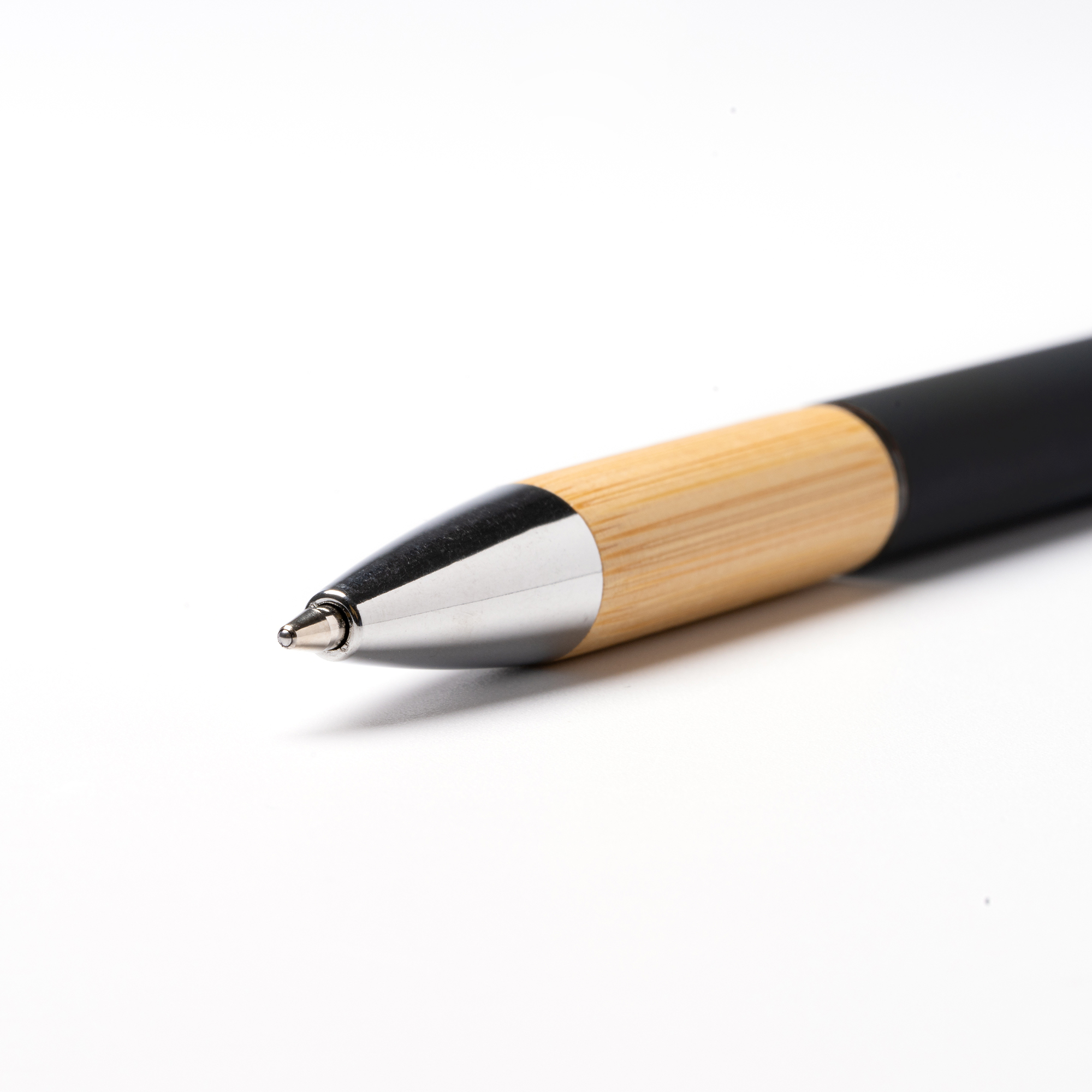 Bolígrafo con cuerpo elaborado en aluminio con empuñadura en bambú. Pulsador, punta y detalles en acabado cromado. Con detalle en el extremo del pulsador en color negro. Tinta azul.