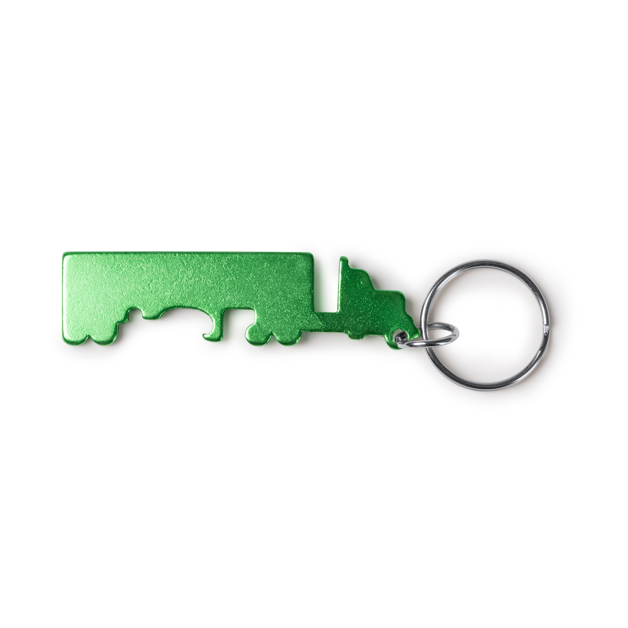 Llavero abridor en forma de camión realizado en aluminio reciclado.