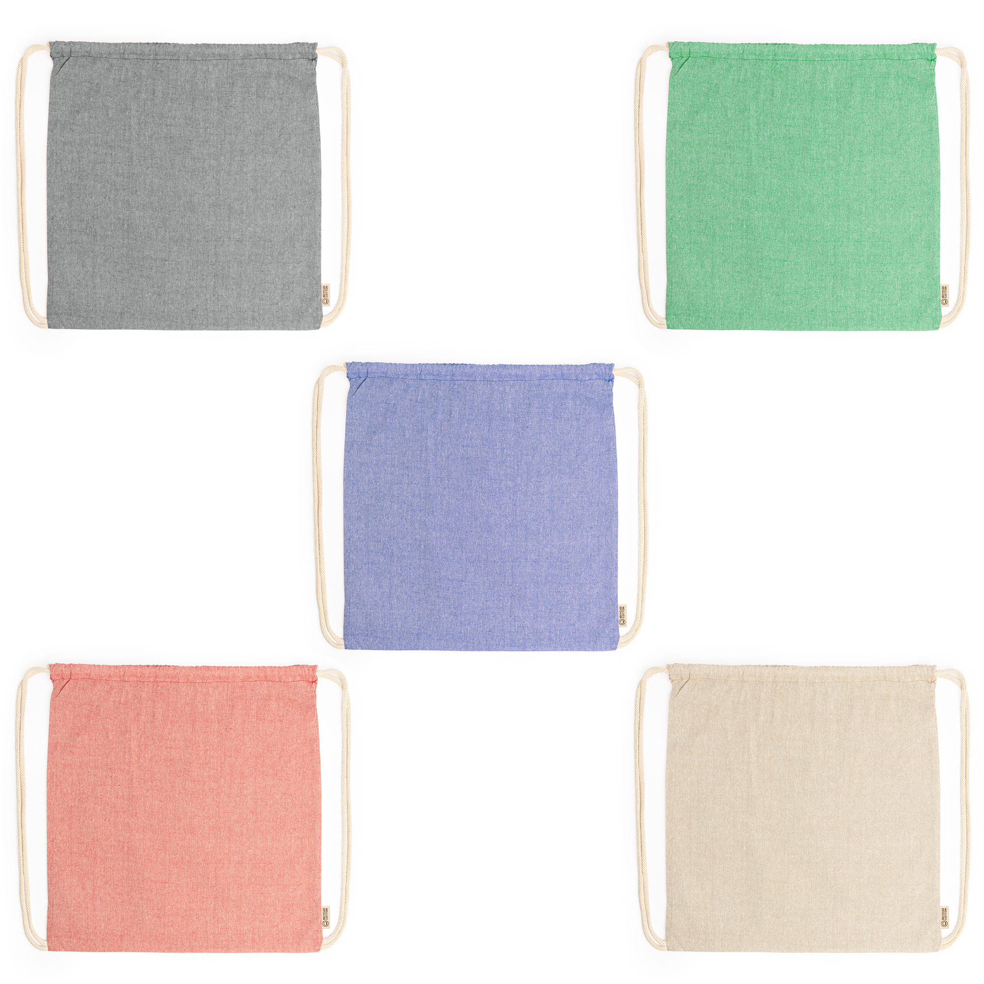 Mochila de cordones en algodón reciclado de 120 g/m² con acabado jaspeado y cordones en color natural. Disponible en varios colores.