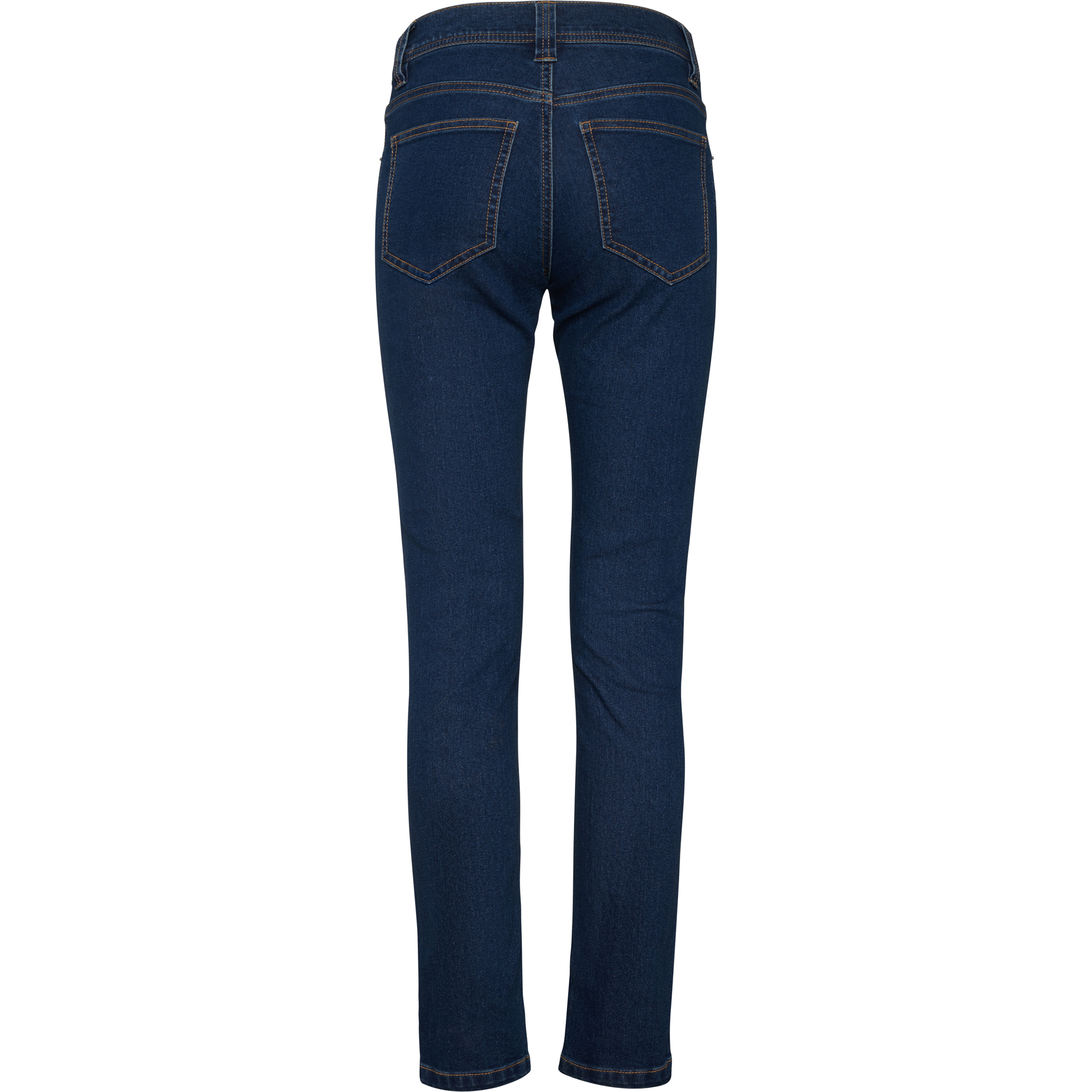 Pantalón vaquero de mujer de corte regular. Tiro medio. 5 trabillas. Bragueta con cremallera y botón metálico. Dos bolsillos laterales y uno portamonedas en lado derecho. Dos bolsillos traseros angulados.