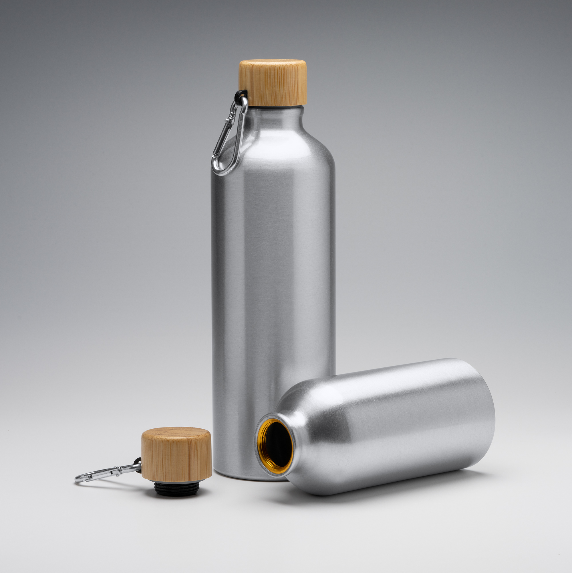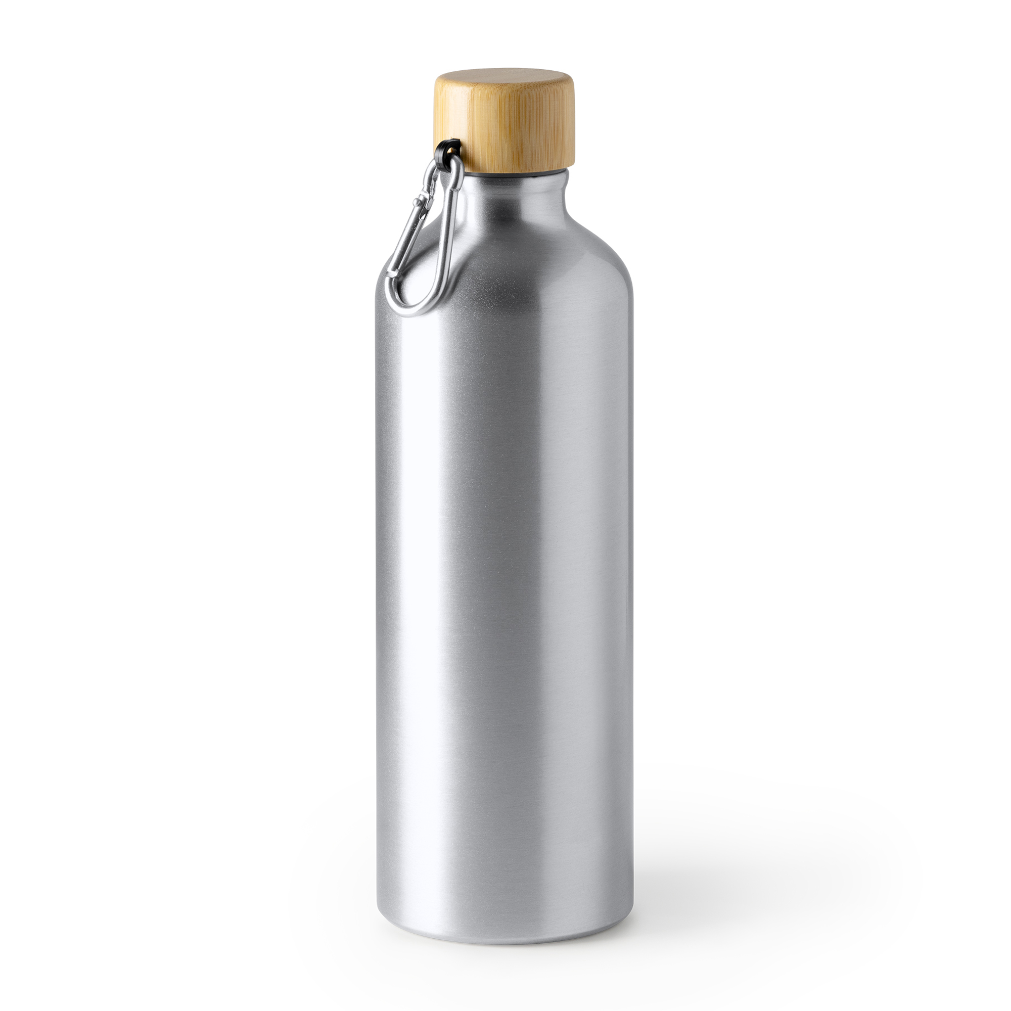Bidón de aluminio con mosquetón para un fácil transporte y tapón de bambú. Capacidad de 800 ml.