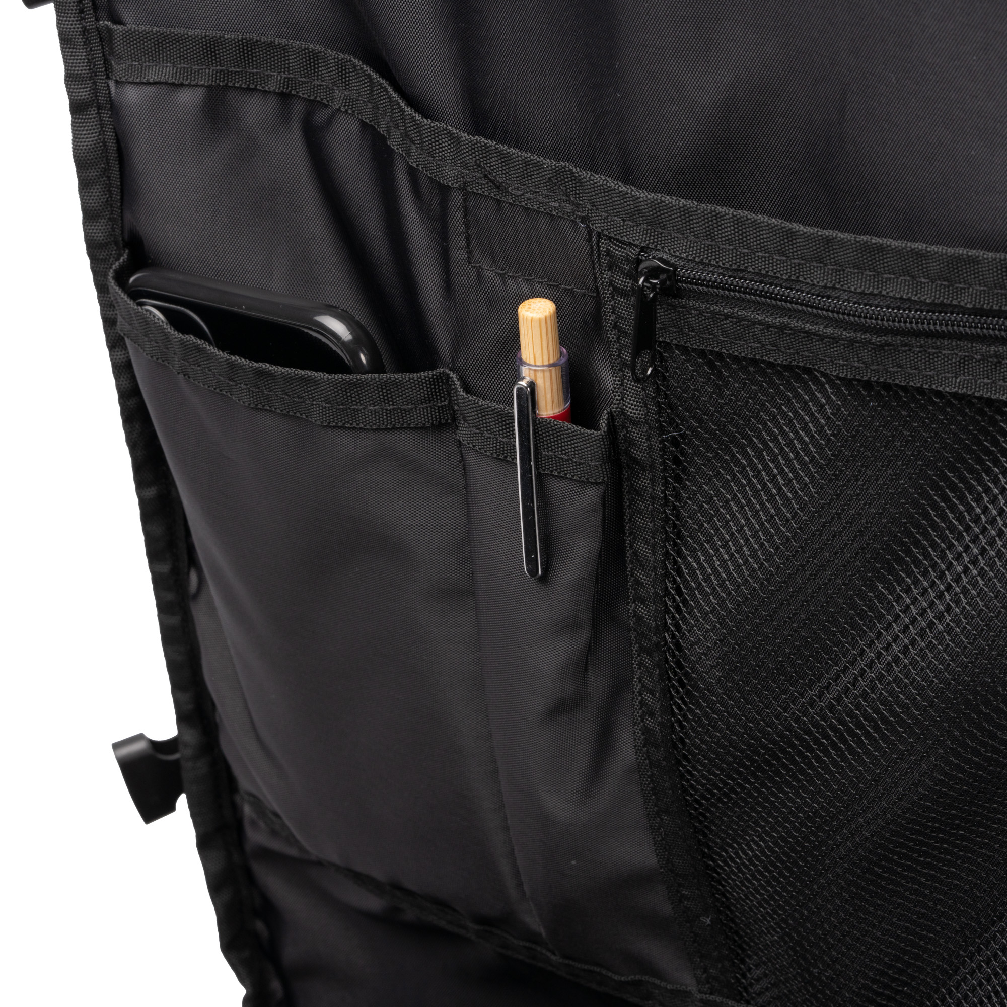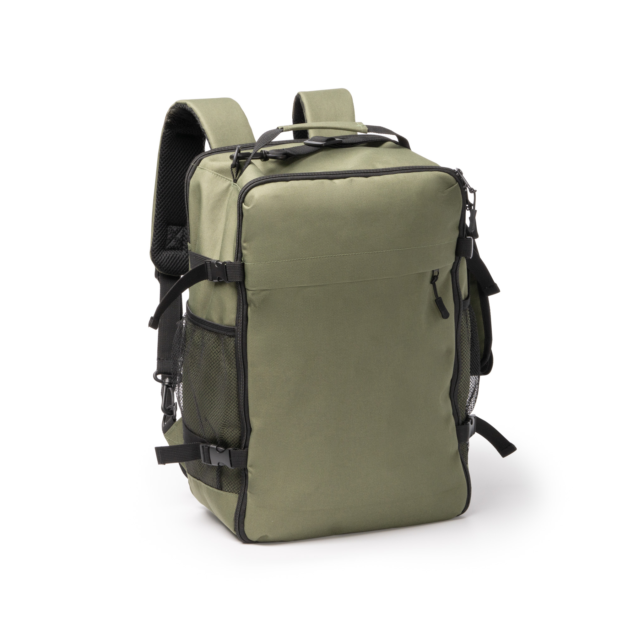 Mochila para viaje de gran capacidad elaborada en RPET 600D con apertura de 180ª. Cuenta con un compartimento principal de gran capacidad con pequeños separadores internos con diferentes tamaños, para hacer más fácil la organización y guardado de enseres. Las hebillas ajustables de sus laterales permiten acomodar el contenido de este compartimento principal. Incorpora un bolsillo frontal exterior de gran amplitud con cierre de cremallera. En su parte trasera cuenta con un compartimento acolchado, además, cuenta con dos bolsillos laterales elaborados en tejido de rejilla con ajuste elástico para guardar botellas e incluye un bolsillo antirrobo en el reverso de la mochila que sirve también como espacio de guardado de las asas, que se pueden separar del cuerpo de la mochila gracias al mosquetón que incorporan. Para mayor comodidad en su transporte, esta mochilla cuenta tanto con asas como con una cinta bandolera ajustable de transporte extraíble mediante mosquetones. Tanto las asas como la espalda van acolchadas. Incluye cinta para trolley.