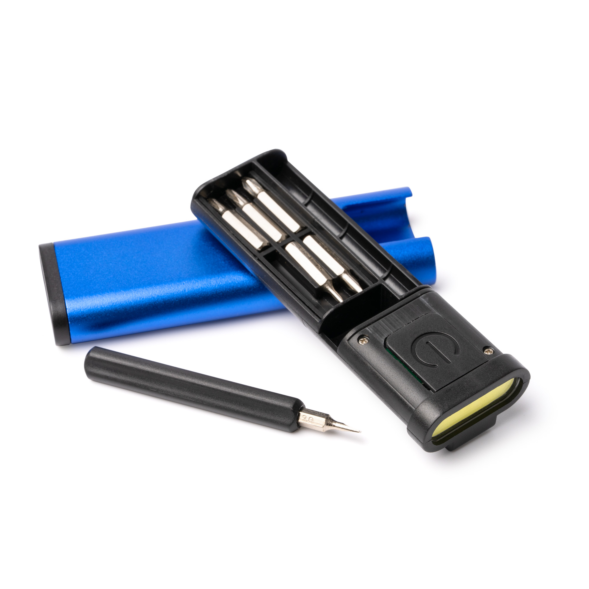 Multiherramienta con linterna ultra plana elaborada en aluminio con detalles en ABS. La linterna cuenta con 70 lúmens. En su interior incorpora un compartimento de guardado con un mango con puntas intercambiables para la función destornillador. Funciona con pilas de botón, incluidas.
