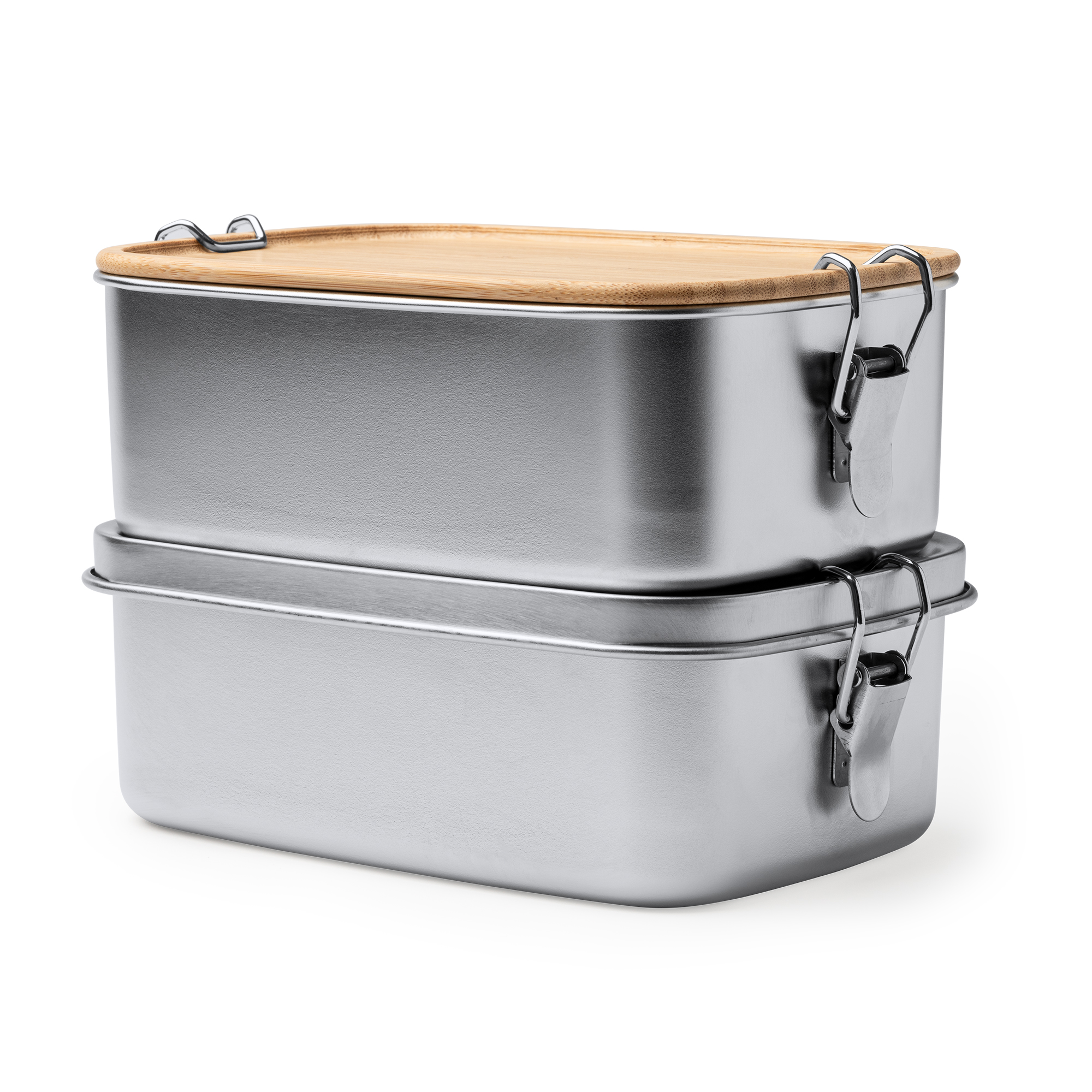Fiambrera de acero inoxidable 304 con tapa de bambú. Sistema de cierre mediante hebillas laterales. Gran capacidad 1L para almacenar la comida. Fiambrera personalizable.