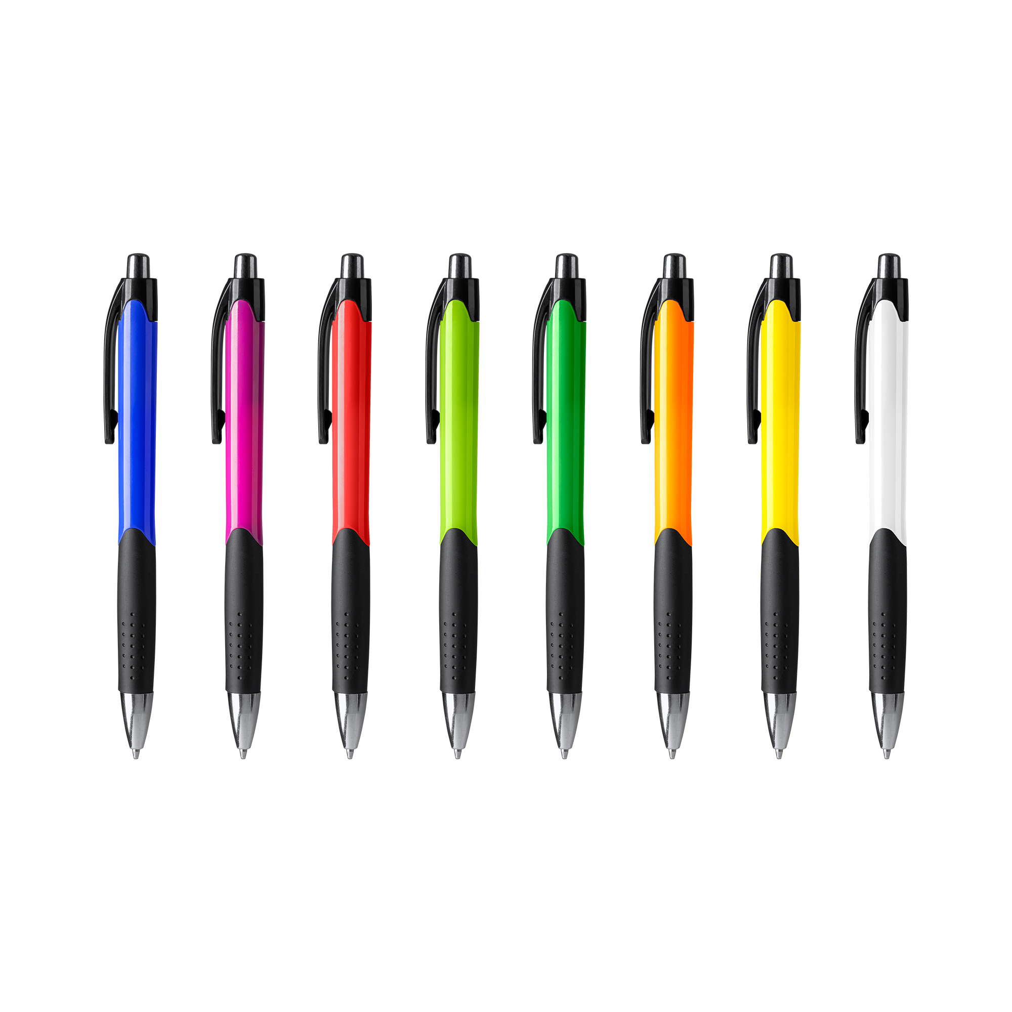 Bolígrafo de ABS con pulsador. Cuerpo en variada gama de colores con cómoda empuñadura antideslizante. Detalles en negro y metalizados.