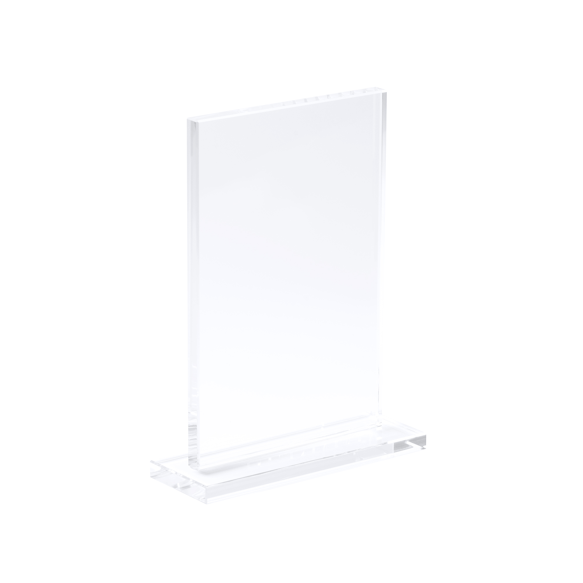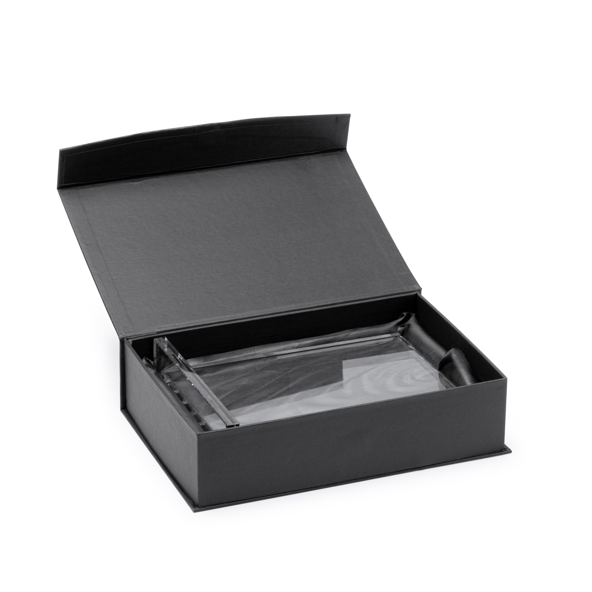 Trofeo de cristal de diseño rectangular. Incluye estuche de presentación con base acolchada en color negro.