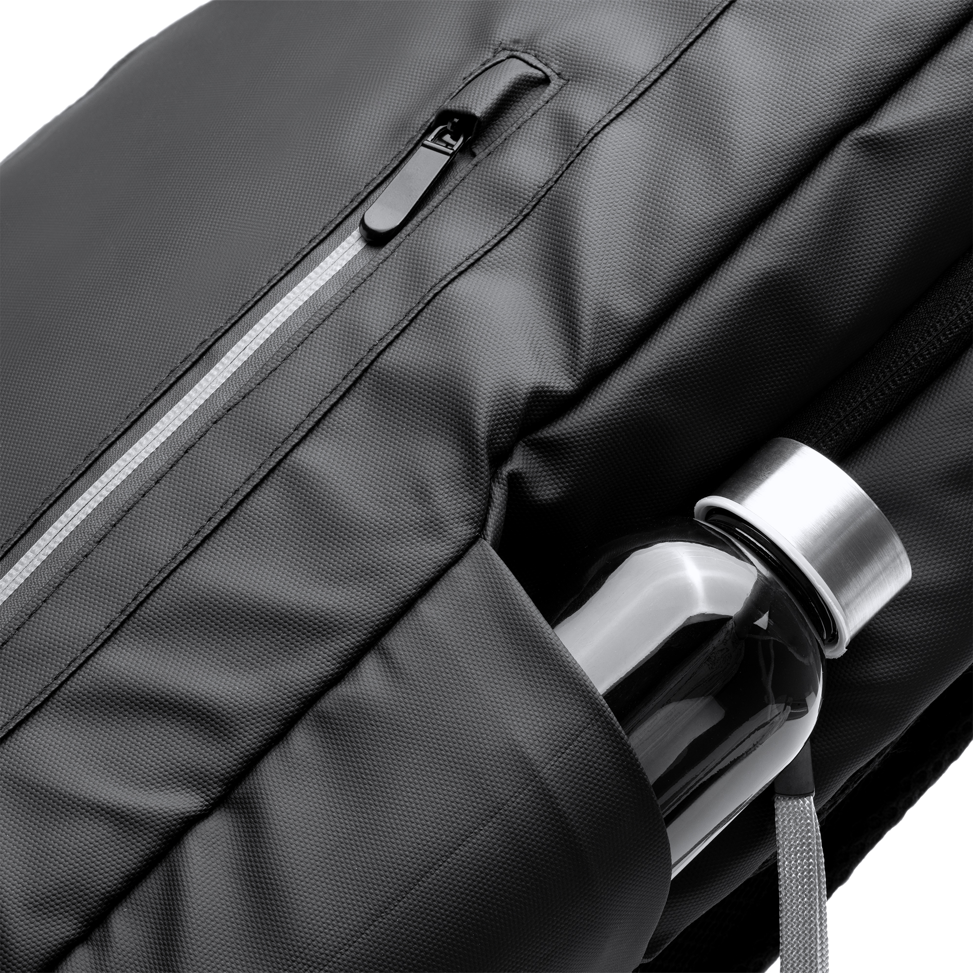 Mochila ejecutiva de PU Leather con cuerpo y asas acolchadas. En el interior cuenta bolsillo interior acolchados optimizados para el transporte de ordenador portátil de 13″ o tablet. Además, cuenta con un bolsillo exterior con cremallera impermeable y una banda reflectante. Con un doble compartimento y bolsillos laterales, especialmente pensados para el transporte de botellas. También cuenta con una cinta para trolley, facilitando el transporte en combinación con una maleta con ruedas.