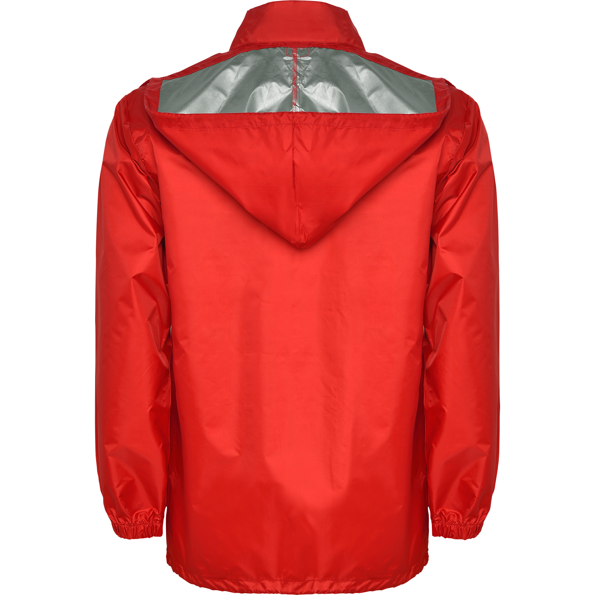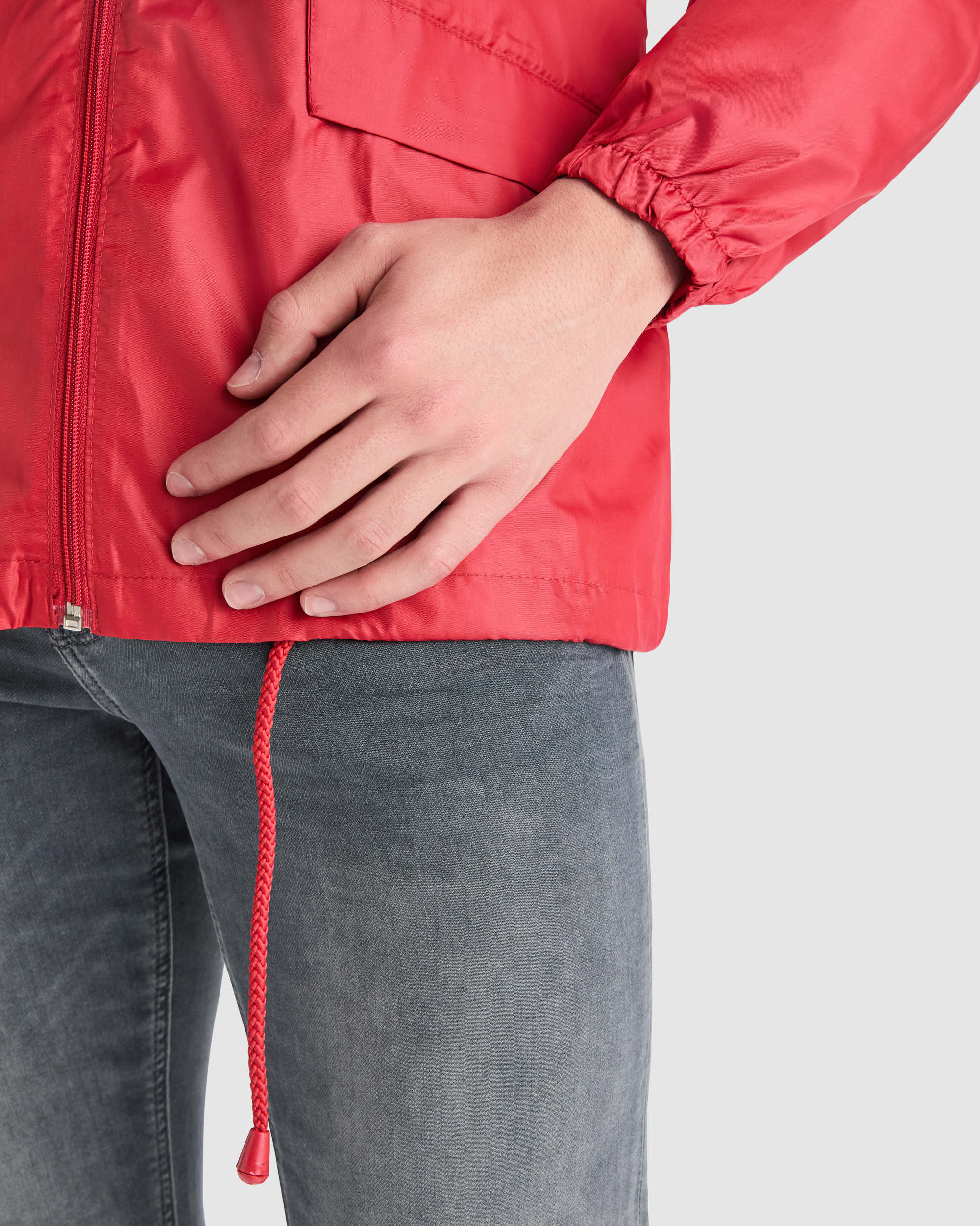 Chubasquero con cuello alto y capucha extraíble con cordón ajustable. Interior con revestimiento de plata. Cremallera frontal al tono. Bolsillos laterales con cremallera cubiertos por solapa del mismo tejido. Puños elásticos. Bajo con cordón interno ajustable. Goma en bolsillo para su plegado.