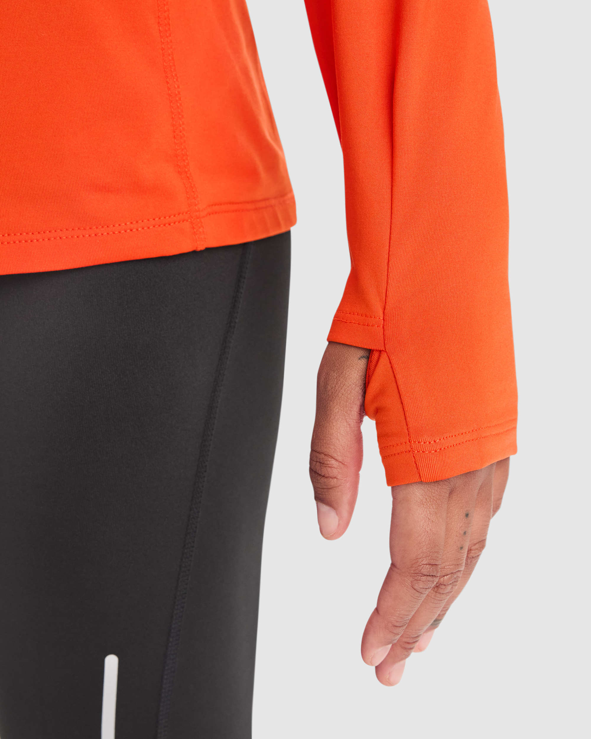 Sudadera técnica perchada manga ranglán entallada y media cremallera invertida con detalle reflectante. Cubrecosturas en cuello interno. Puños con ojal para pulgar. Detalles reflectantes en la espalda. Faldón trasero. Certificado GRS.