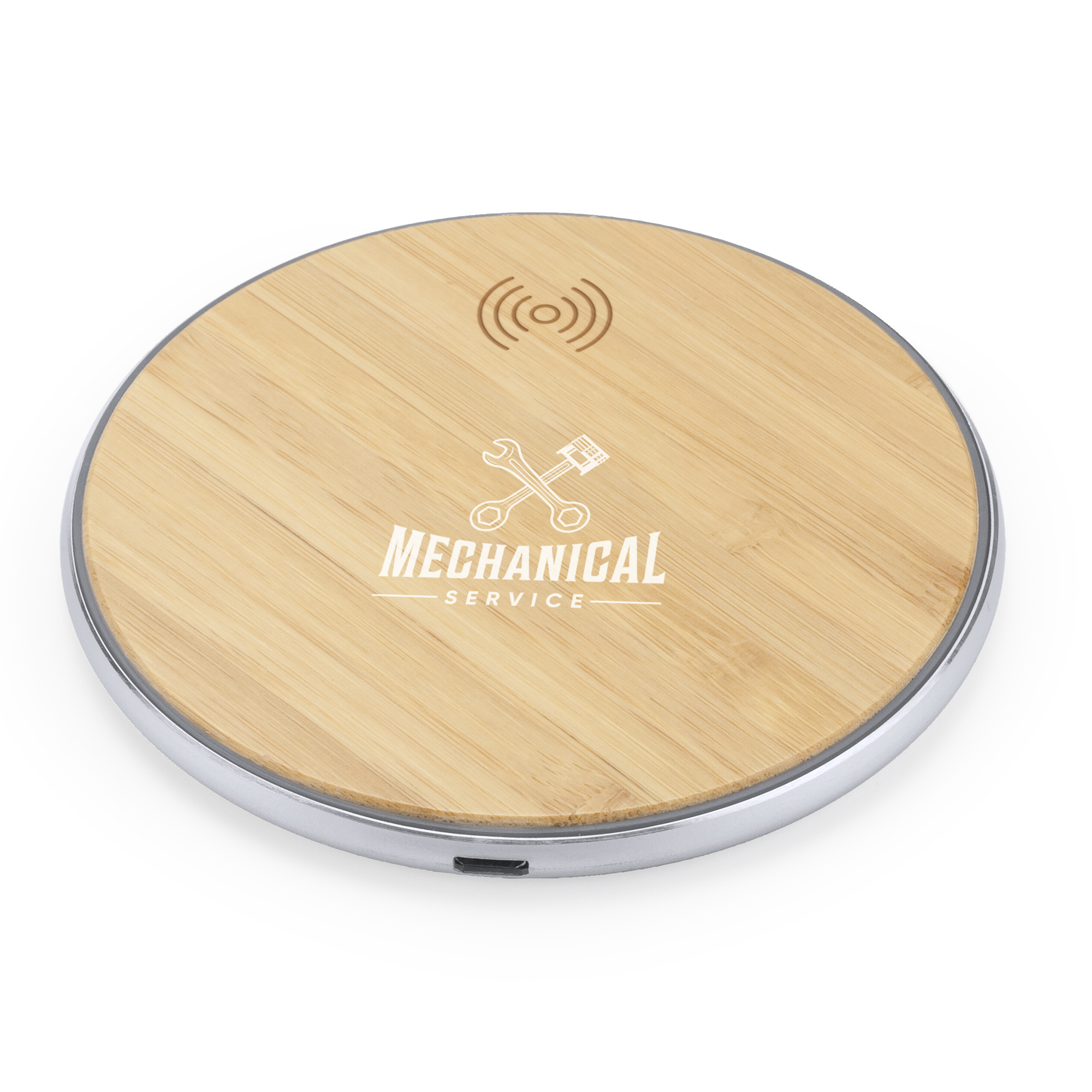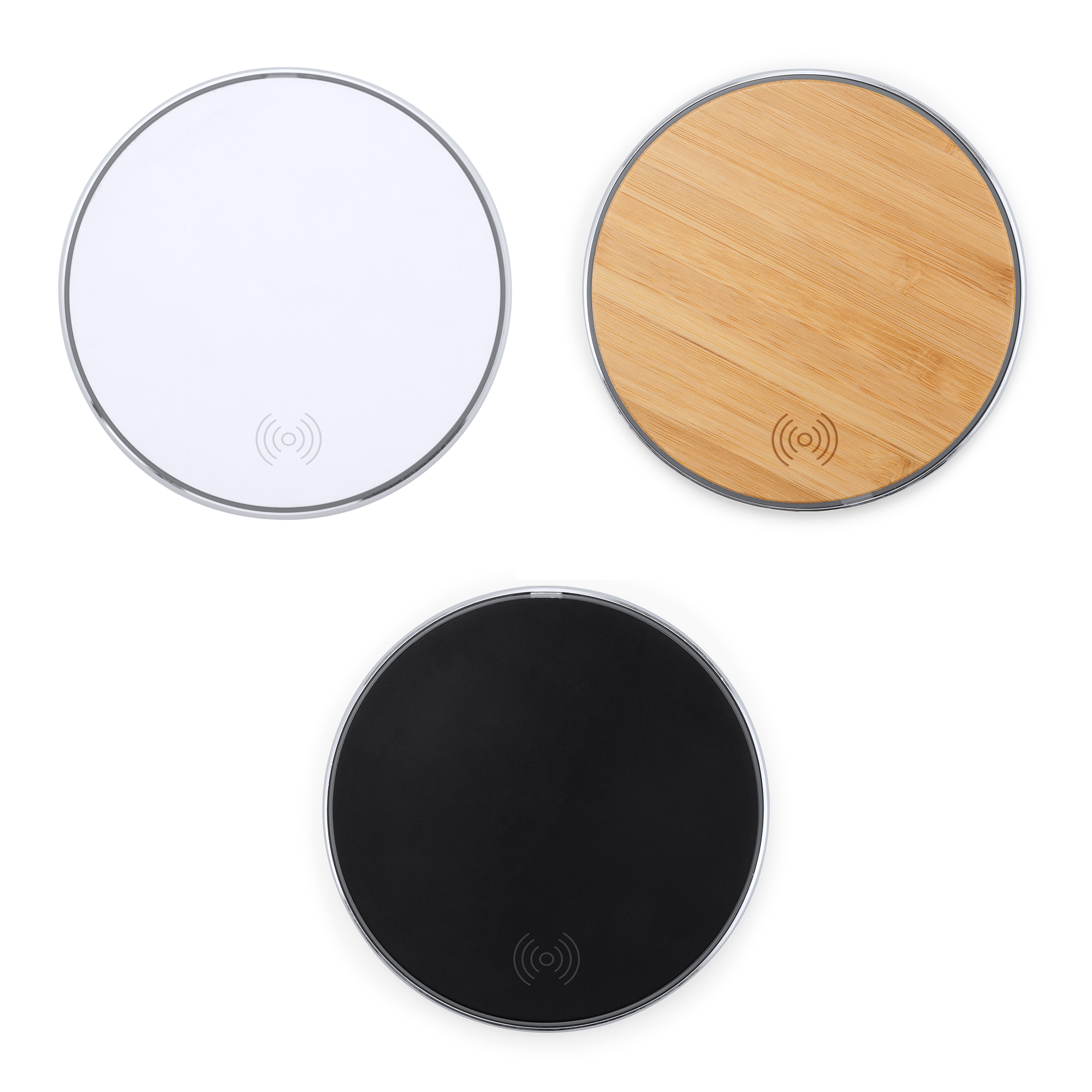 Cargador inalámbrico con cuerpo realizado en aluminio con superficie en bambú o color. Con 10W de potencia. Base antideslizante. Cuenta con indicador luminoso de carga. Compatible con dispositivos provistos de tecnología de carga de este tipo.