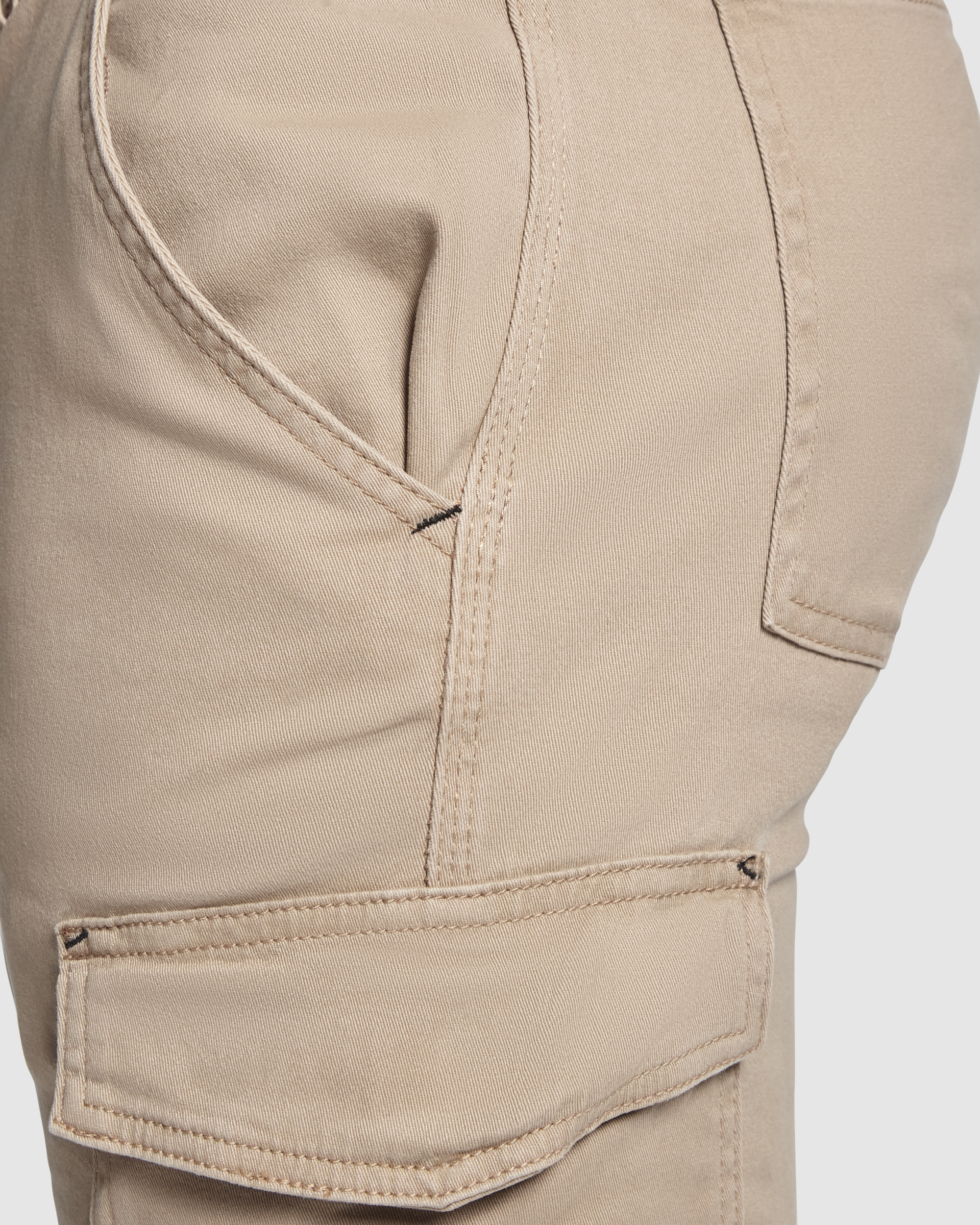 · Un bolsillo cargo con tapeta y cierre de velcro en la pierna izquierda y uno alargado para herramientas en la derecha.