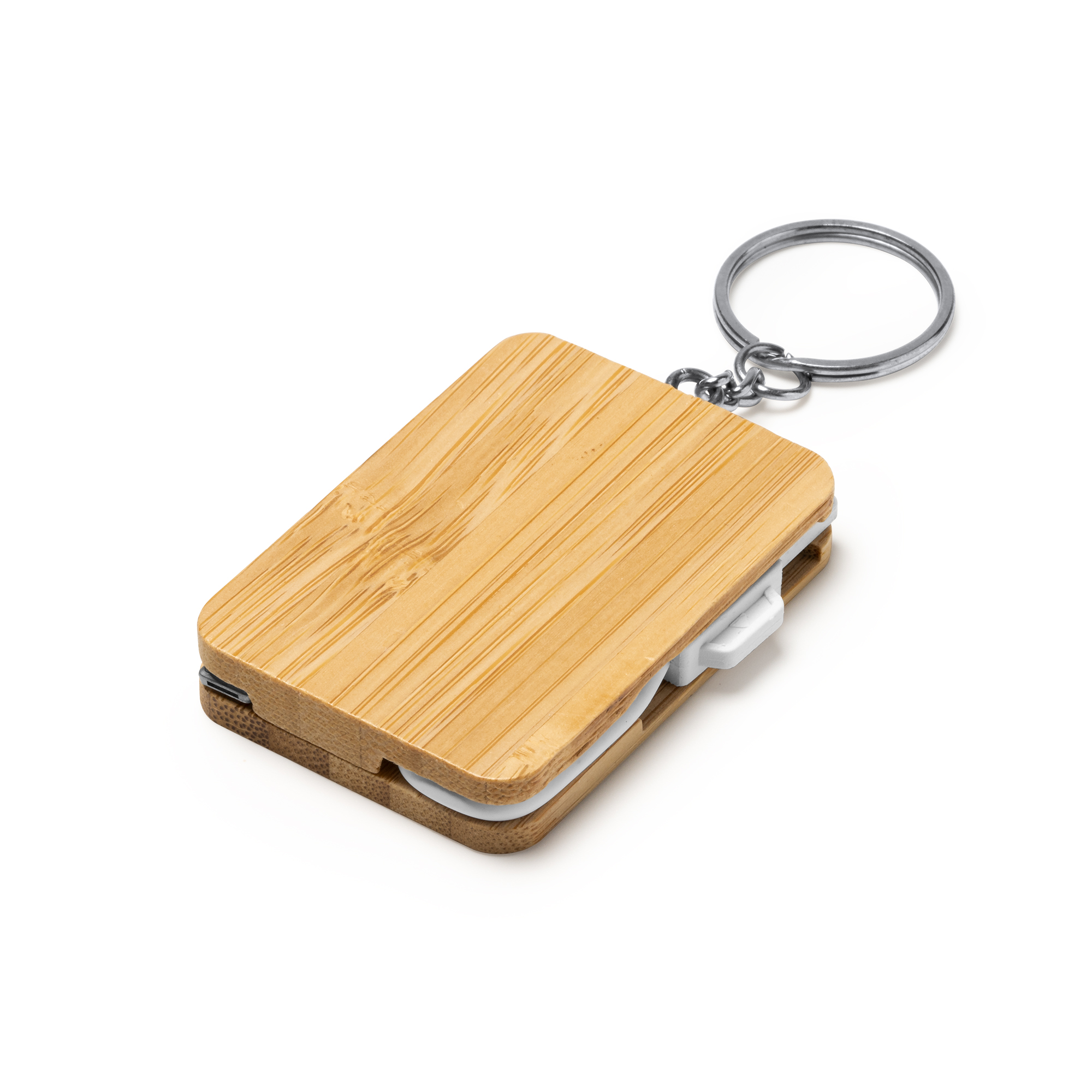 Cable cargador 4 en 1, con cuerpo realizado en bambú. Cuenta con cable Tipo C de entrada y salida y conectores USB y Lightning. Los cables son encajables en las ranuras laterales del cuerpo para mayor comodidad. Con anilla de llavero insertada.