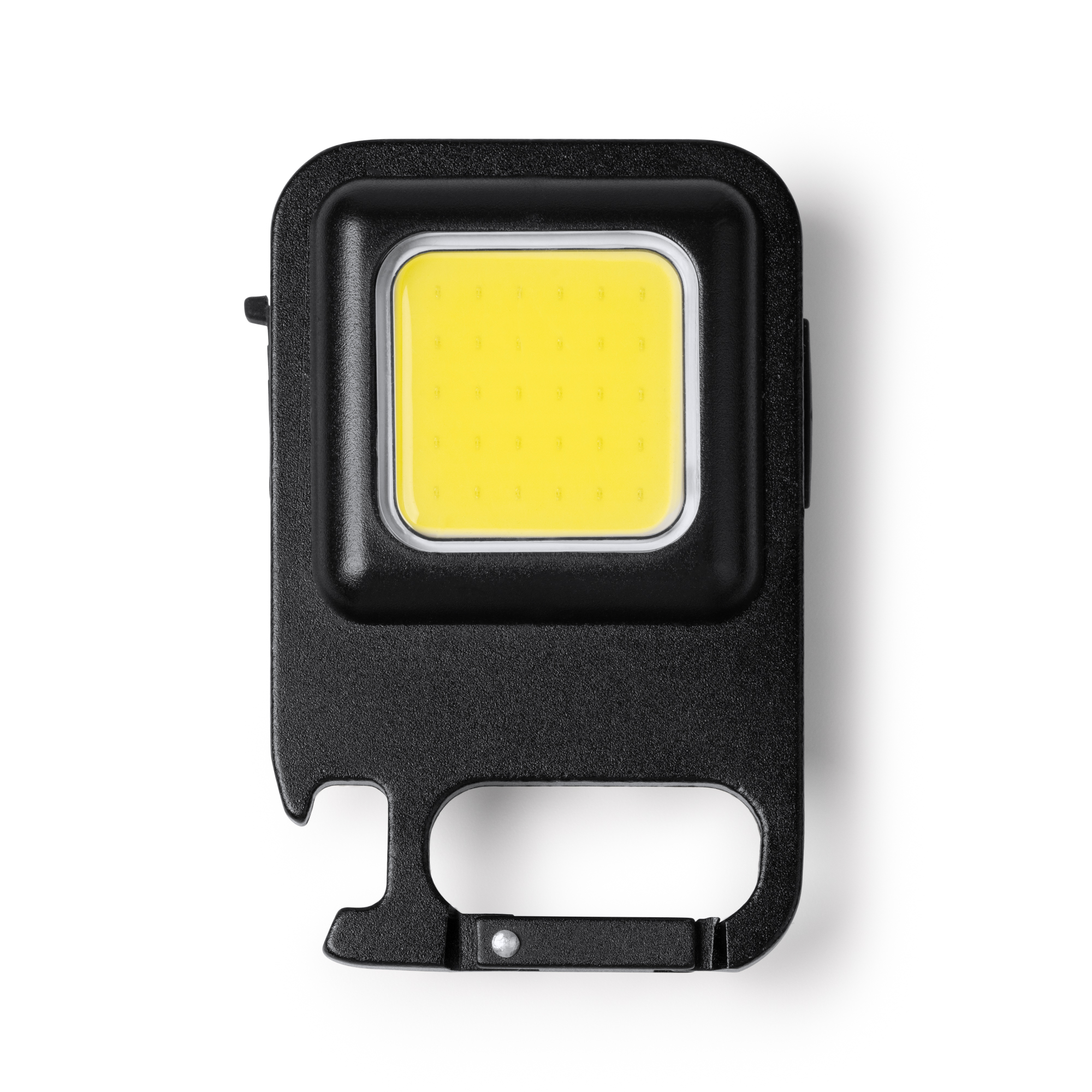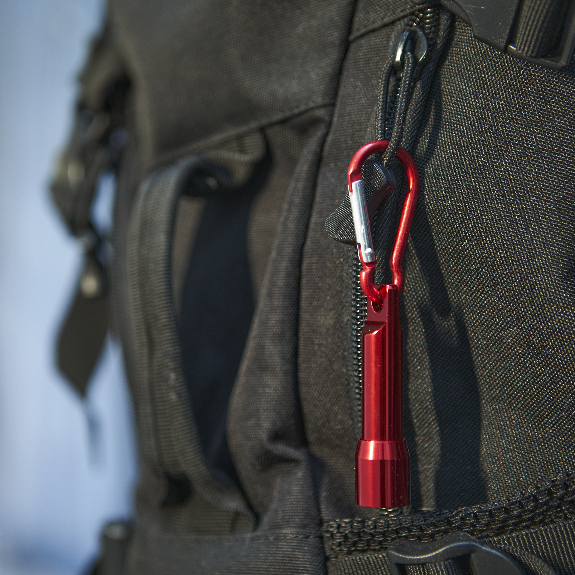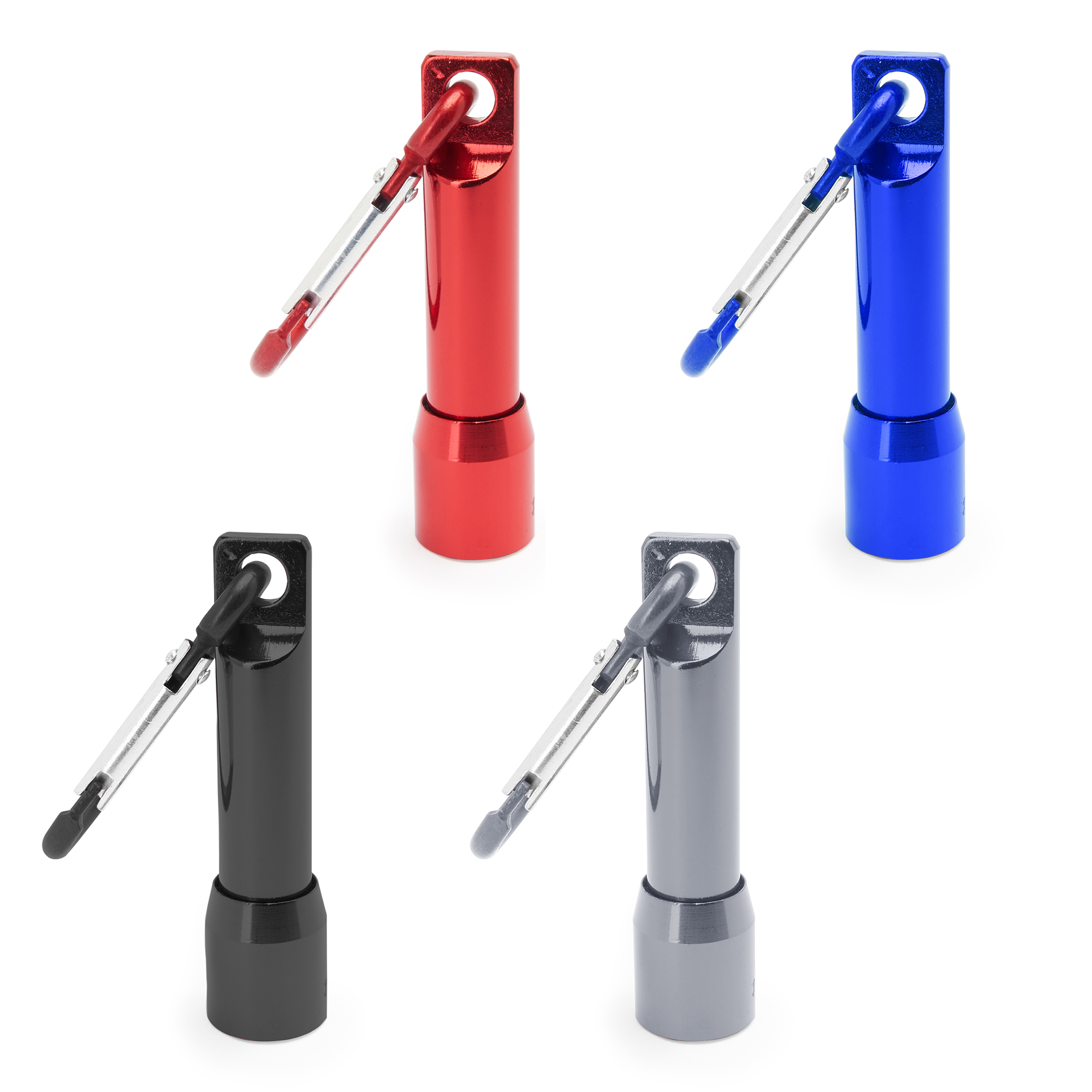 Linterna con 1 luz LED a pilas. Disponible en varios colores metalizados con mosquetón de transporte a juego.