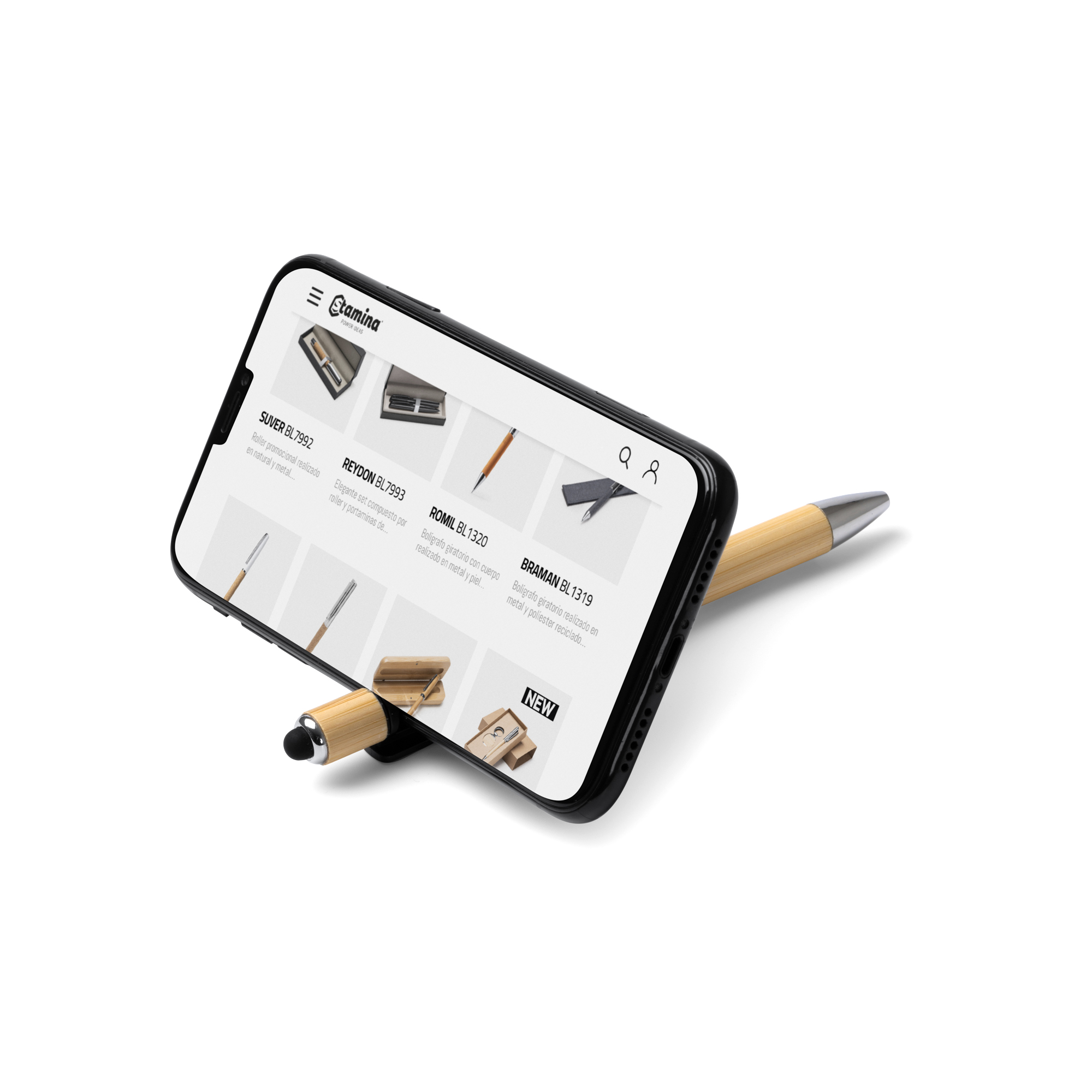 Bolígrafo con función spinner antiestrés. Cuerpo de bambú y soporte para smartphone. Puntero táctil y acabado metálico. Tinta azul.