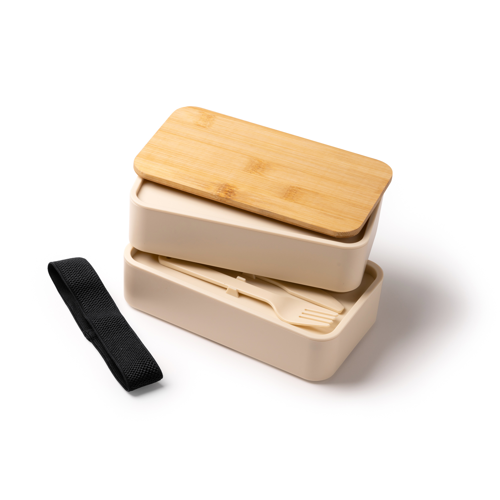 Fiambrera de PP con dos compartimentos apta para alimentos con tapa de bambú. Incluye set de cubiertos integrado en una de las tapas, una pieza separadora extraíble para poder separar diferentes alimentos dentro del mismo compartimento y cinta de seguridad para un cierre más hermético. Capacidad de 800ml.