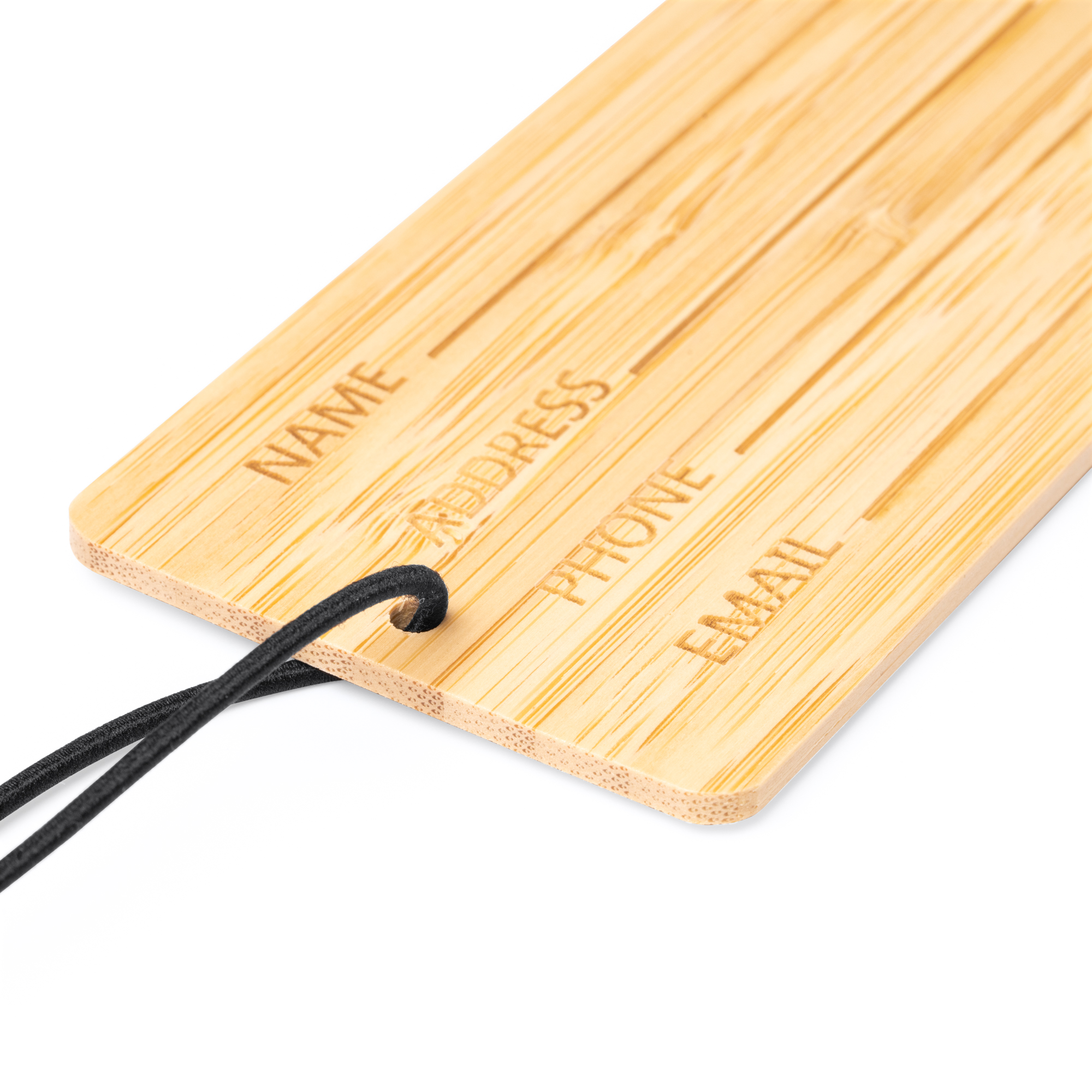 Identificador de maletas de bambú con diferentes campos de información. Cuenta con banda elástica en color negro y nudo en su extremo para hacer más fácil su uso, dotándola con ello de versatilidad en diferentes tipos de sujeciones.