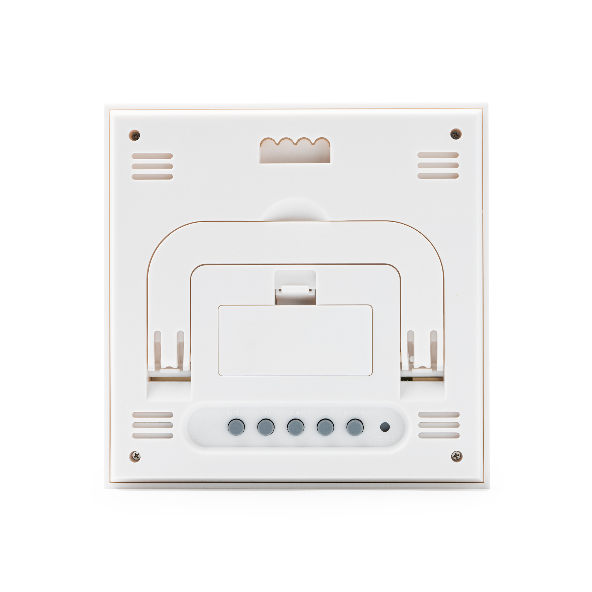 Estación meteorológica con carcasa frontal de bambú. Función reloj, calendario y alarma con sensores de temperatura y humedad. Registro de temperatura y humedad máxima y mínima.
