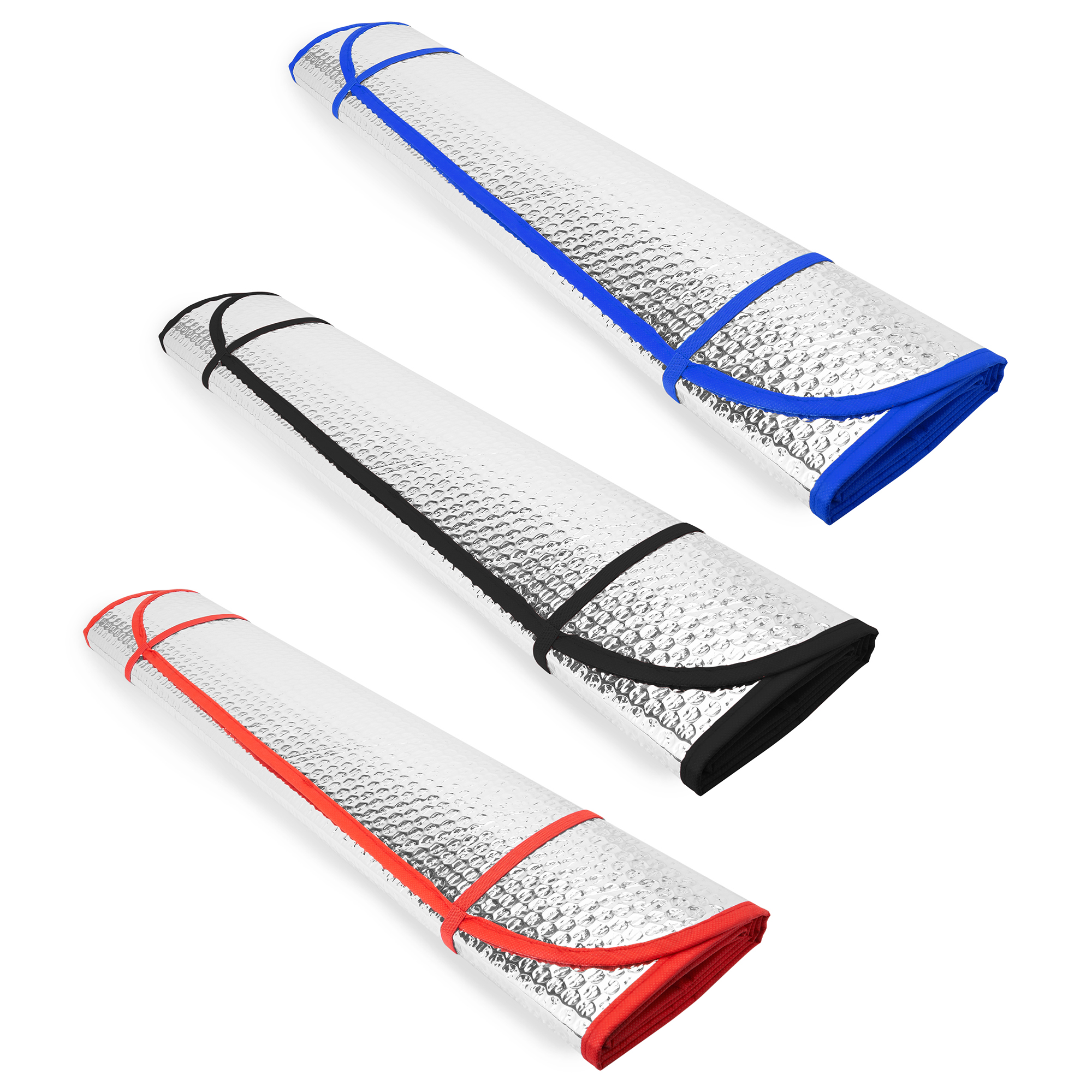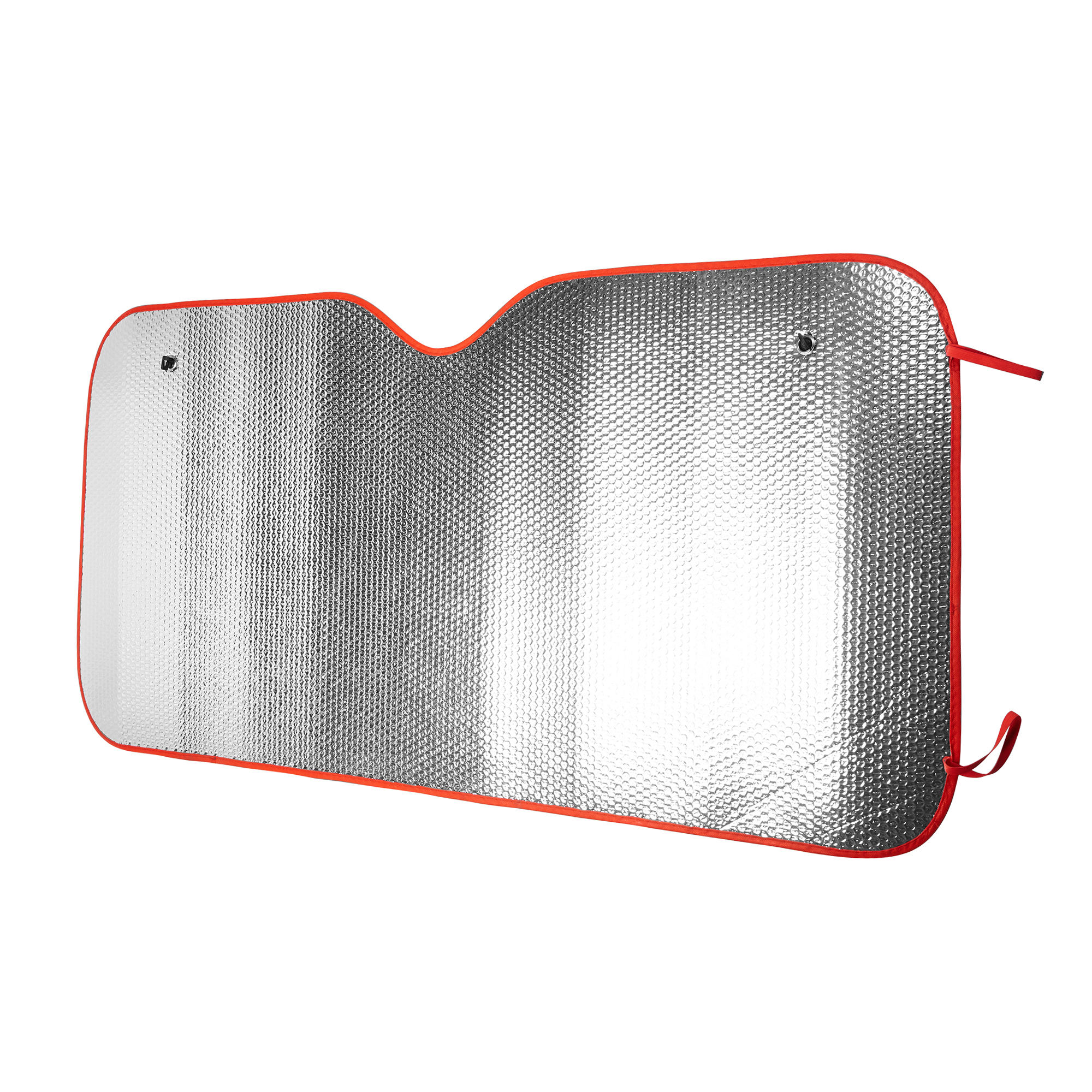 Parasol para coche con burbujas a doble cara en aluminio. Dos orificios en ambas esquinas superiores para la introducción de ventosas de sujeción a la luna del vehículo. Ribete y gomas elásticas para su enrollado en color. Incluye ventosas.