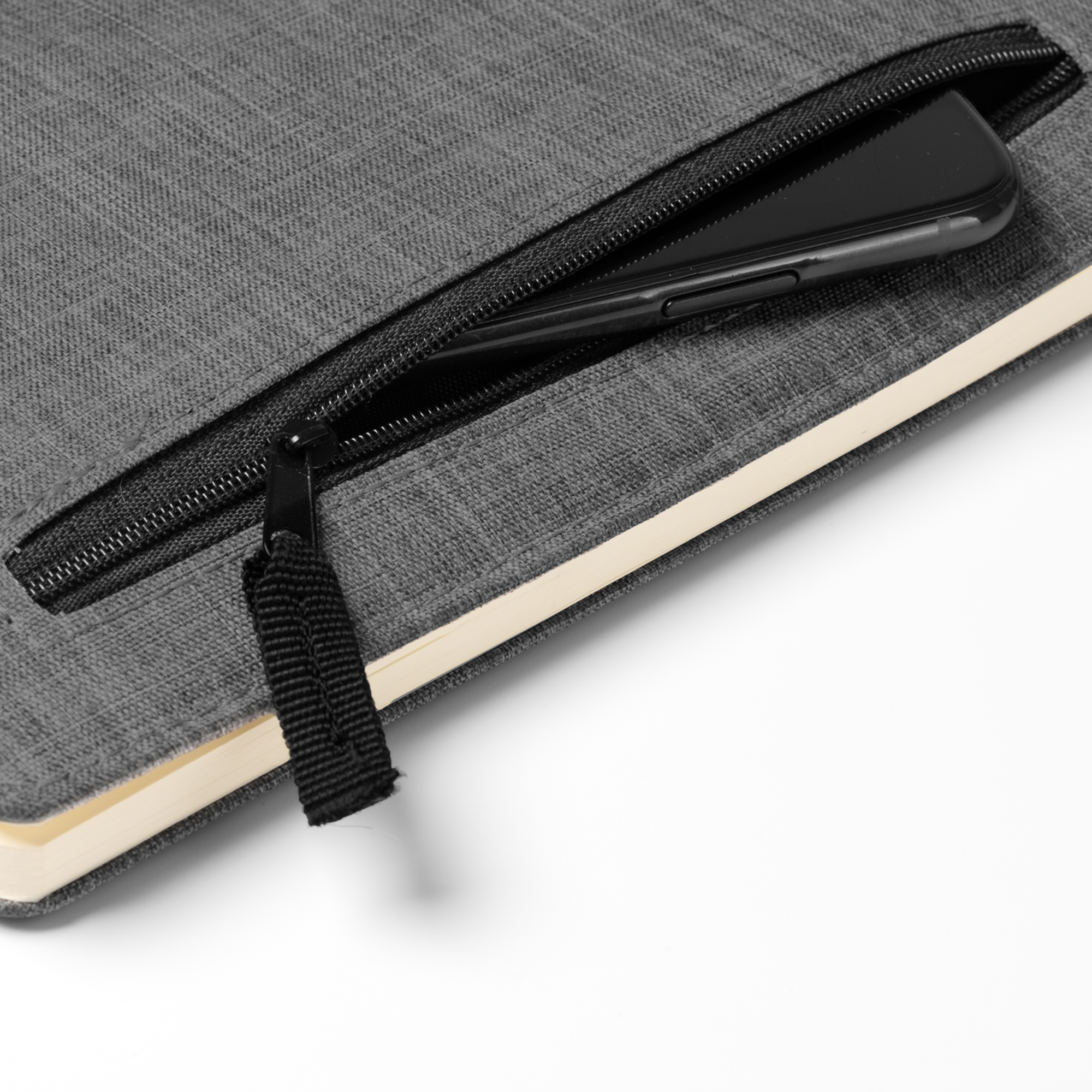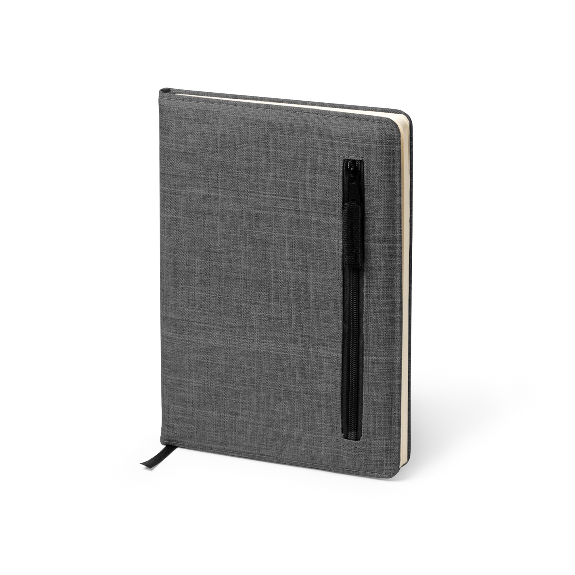 Bloc de notas A5 realizado en RPET. Bolsillo exterior con cierre de cremallera. Incluye marcapáginas. 80 hojas a rayas.