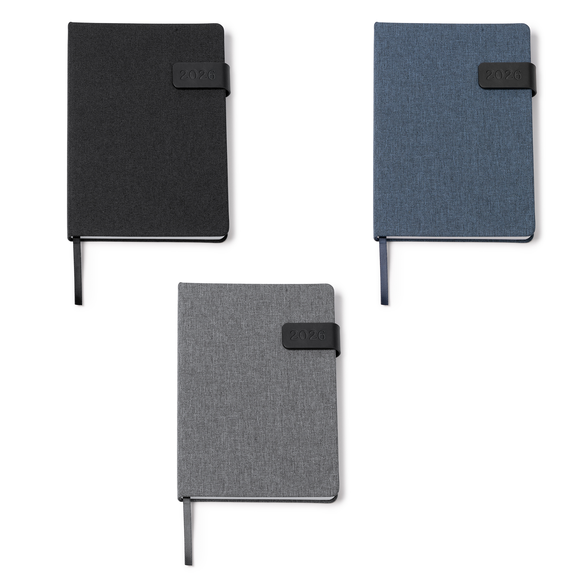 Agenda tamaño A5 realizada con poliéster reciclado RPET con cubierta magnética. 320 páginas más 4 páginas con mapas. Marcador de páginas en color a juego con la portada. Impresión a color 2+2. Papel interior de color blanco.