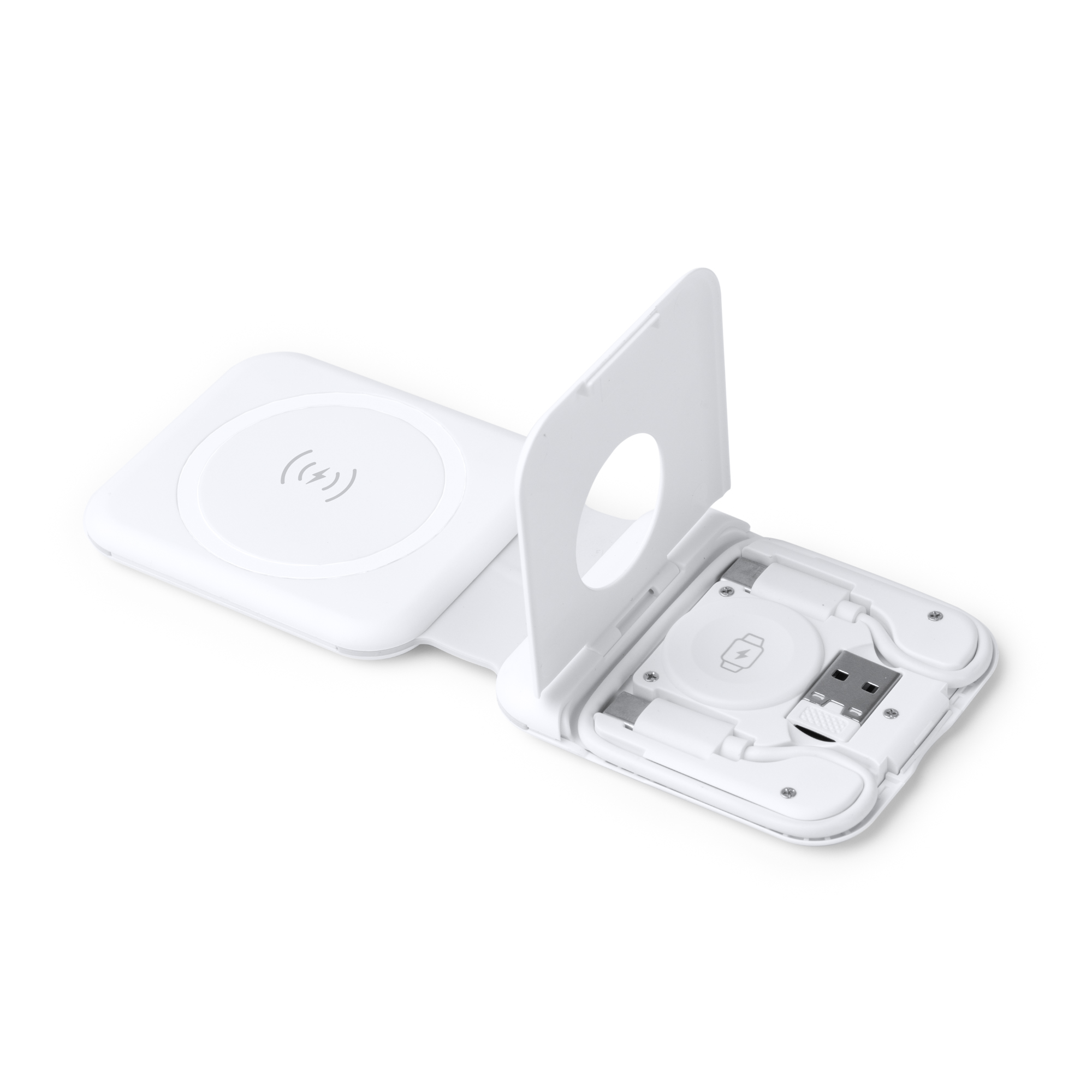 Cargador inalámbrico plegable 3 en 1 con potencia de 15W. Ideal para viajar. Cuenta con una base para carga de smartphone y auriculares inalámbricos, y otra base de carga para smartwatch. Incluye cable Tipo C y adaptador de USB a Tipo C.