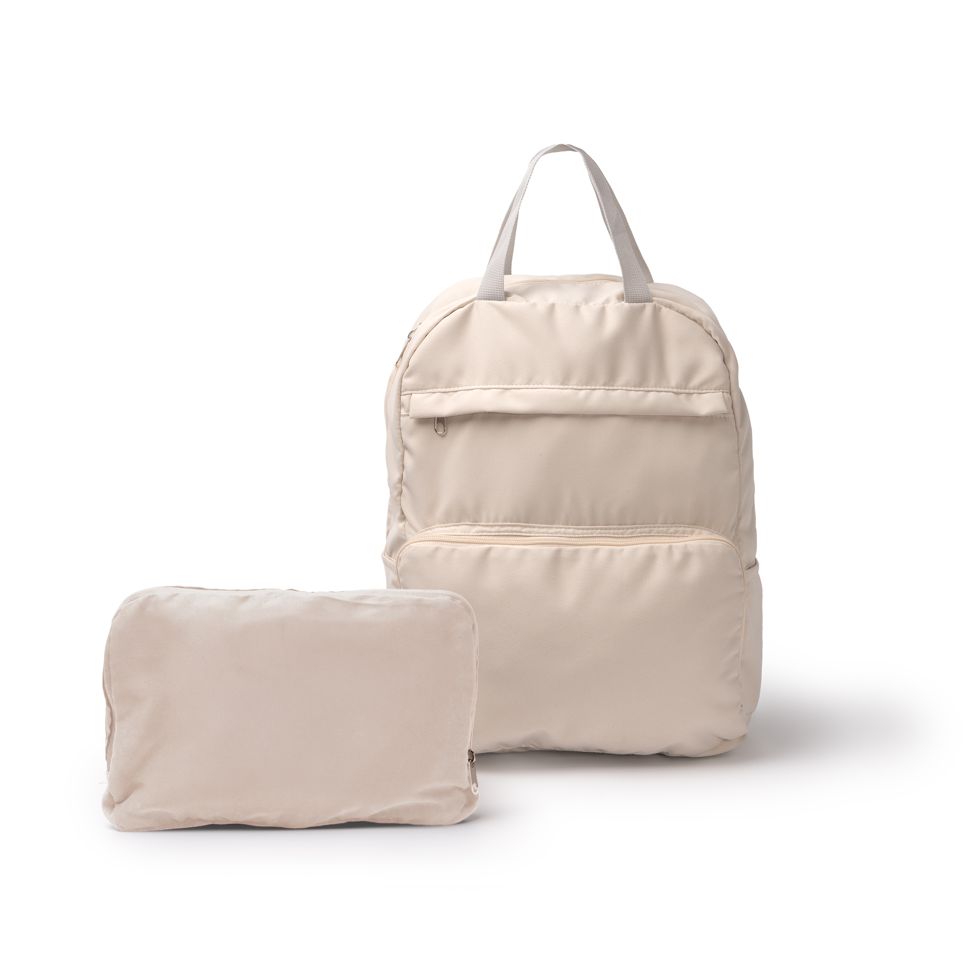 Mochila elaborada en poliéster y algodón. Cuenta con una estructura moldeable gracias a su bolsillo frontal con cremallera doble, que permite que se pliegue, optmizando el espacio y facilitando que se guarde en cualquier rincón. Incorpora un compartimento principal y dos compartimentos frontales para enseres de menor tamaño, todos con cierre de cremallera. Posee doble asa de transporte en la parte superior y asas acolchadas ajustables, además de dos compartimentos laterales para transportar botellas.