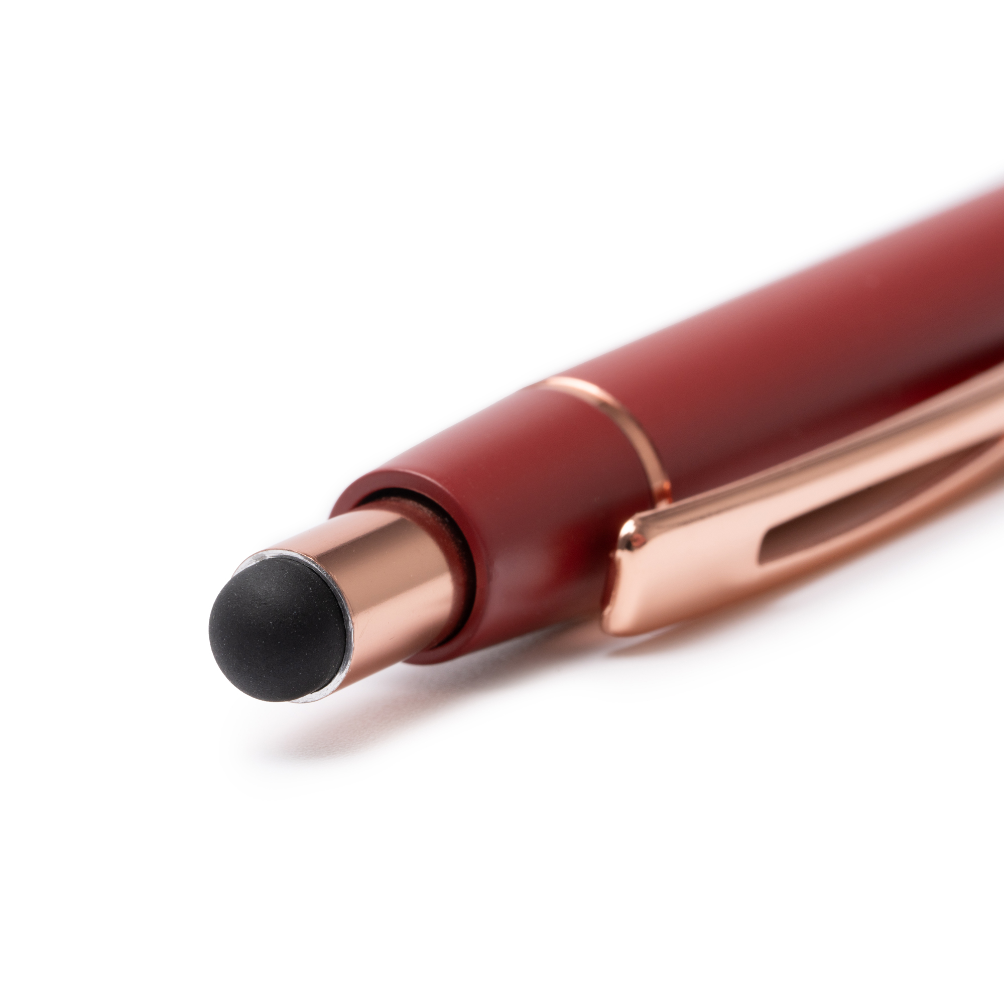 Bolígrafo pulsador con cuerpo metálico en mate y detalles en acabado cobre. Puntero táctil en el pulsador en color negro. Carga jumbo de tinta azul.