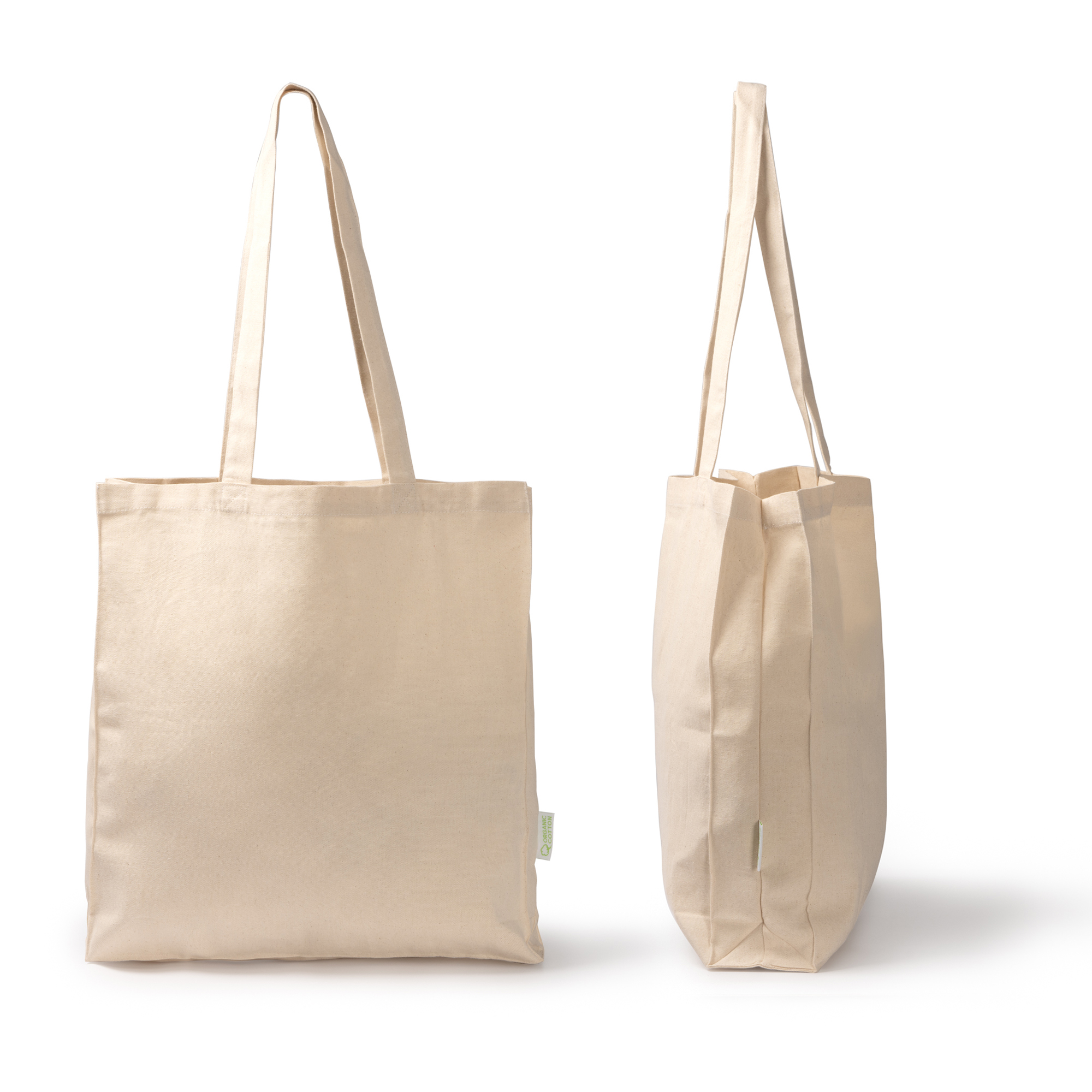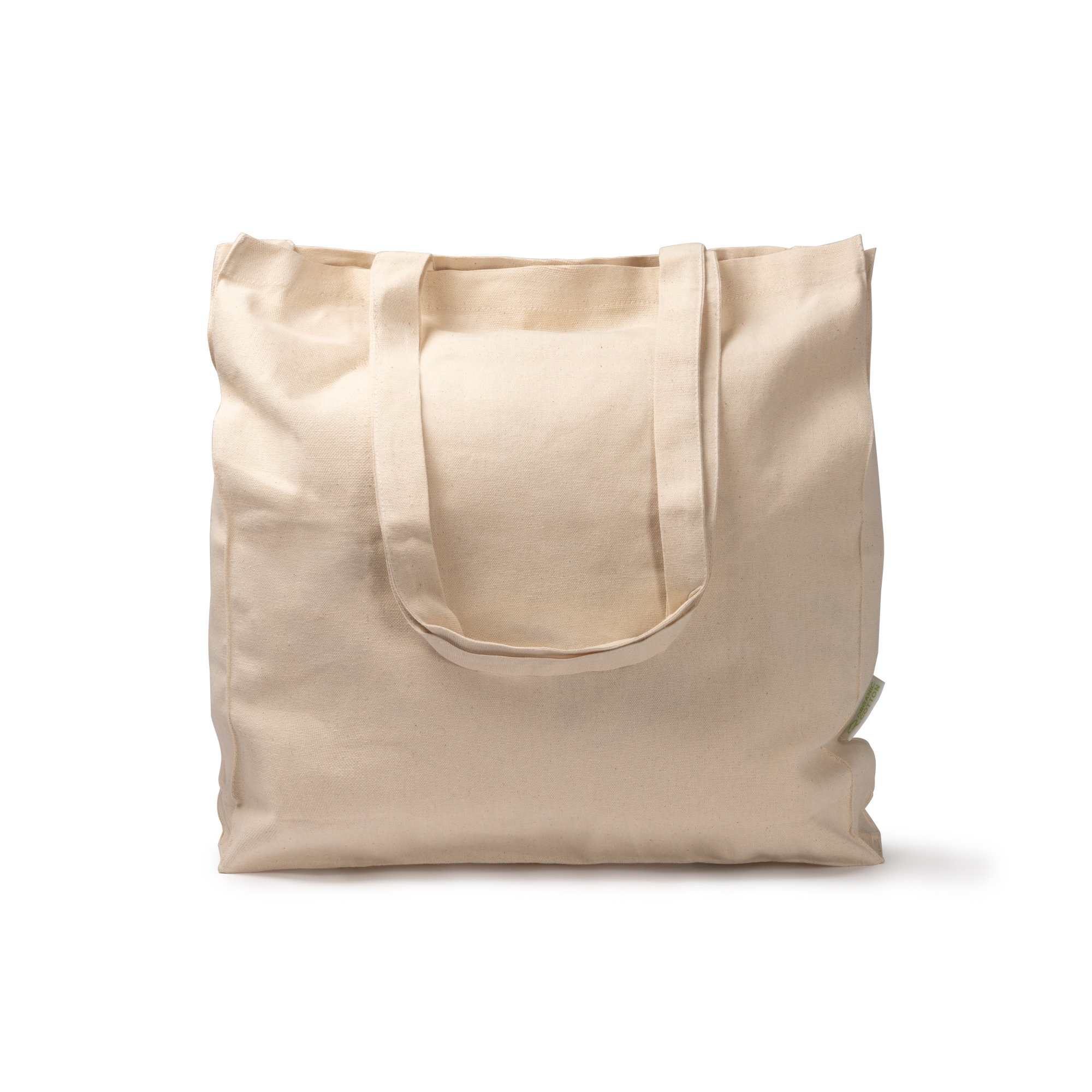 Bolsa 100% algodón orgánico 220 g/m² de con fuelle en la base y laterales para hacerla en una opción adaptable y versátil para transportar tus enseres. Acabado natural con asas de 70 cm lo que la hace una opción práctica, cómoda y sostenible.