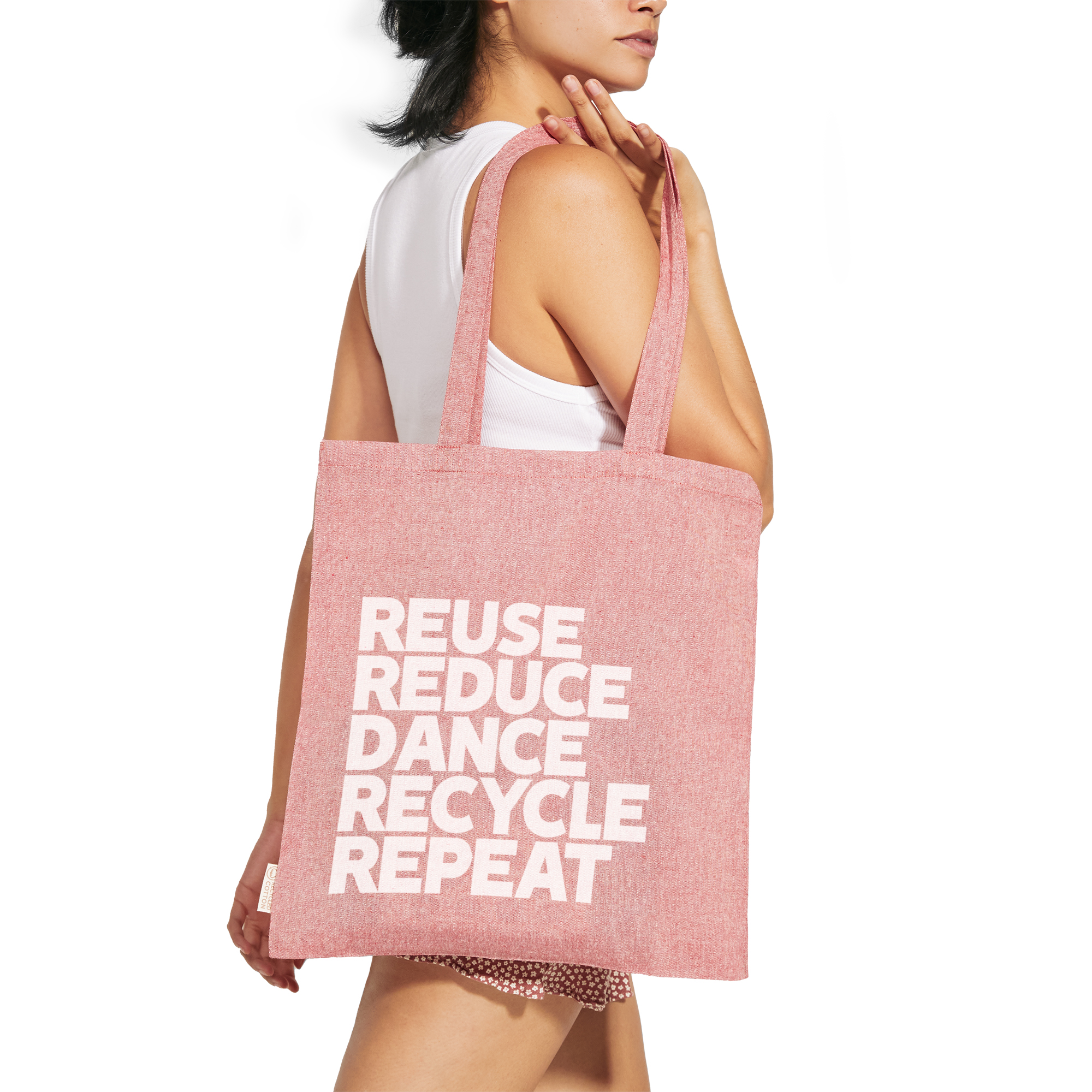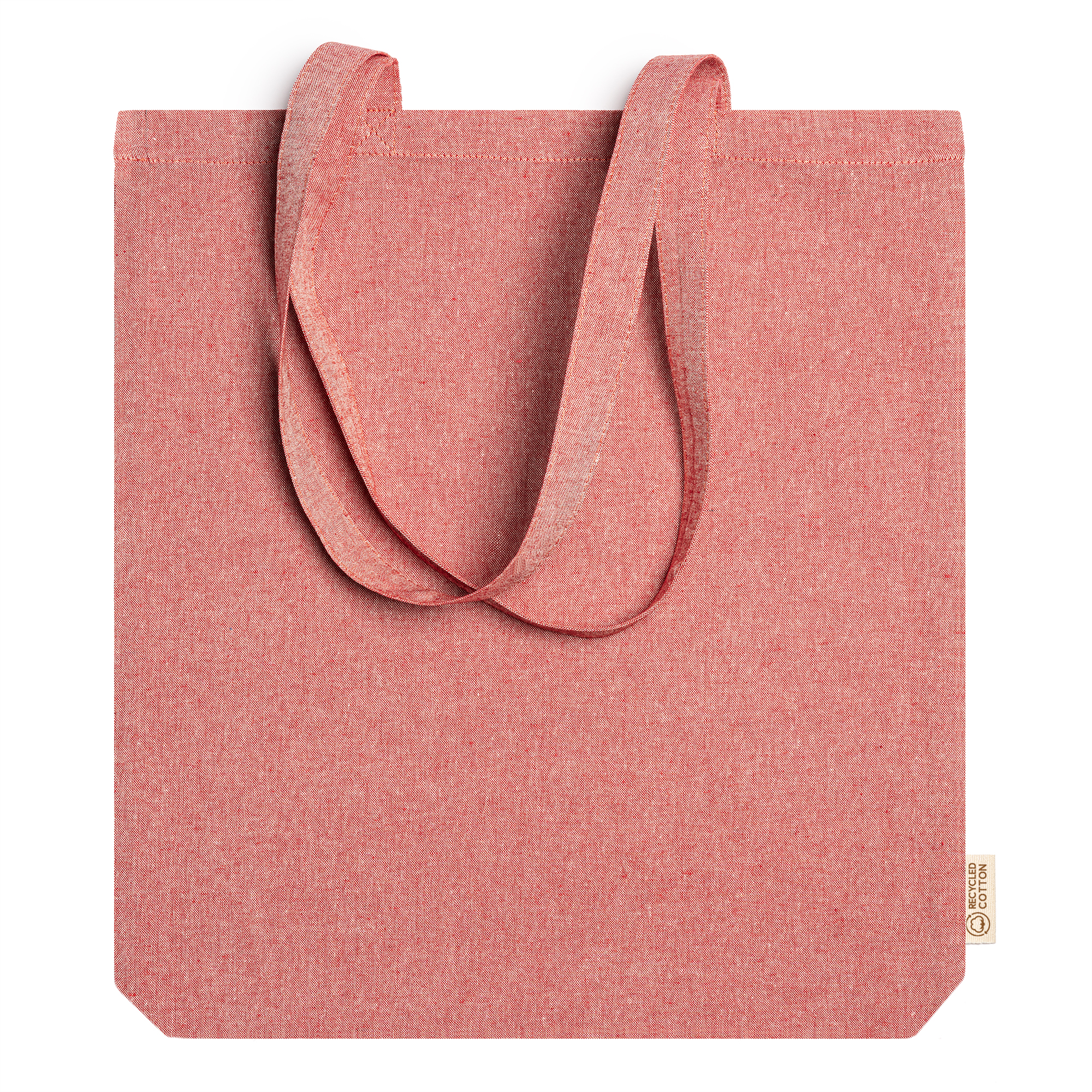 Bolsa realizada en algodón reciclado de 140 g/m² en acabado jaspeado con asas largas de 70 cm.