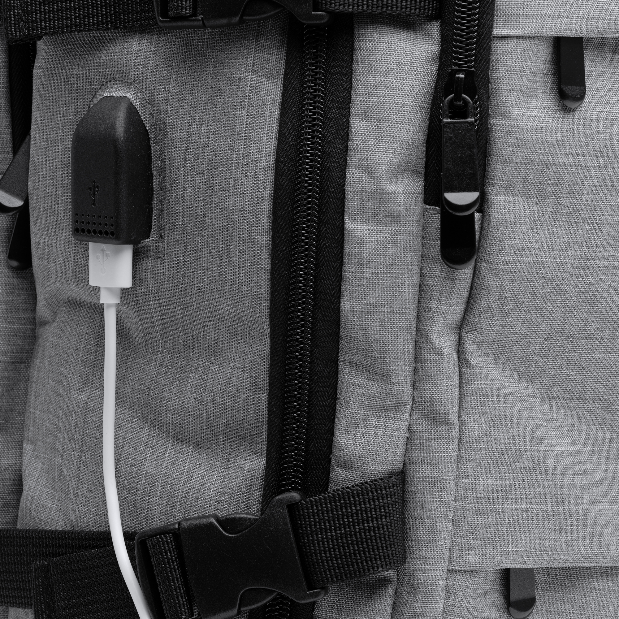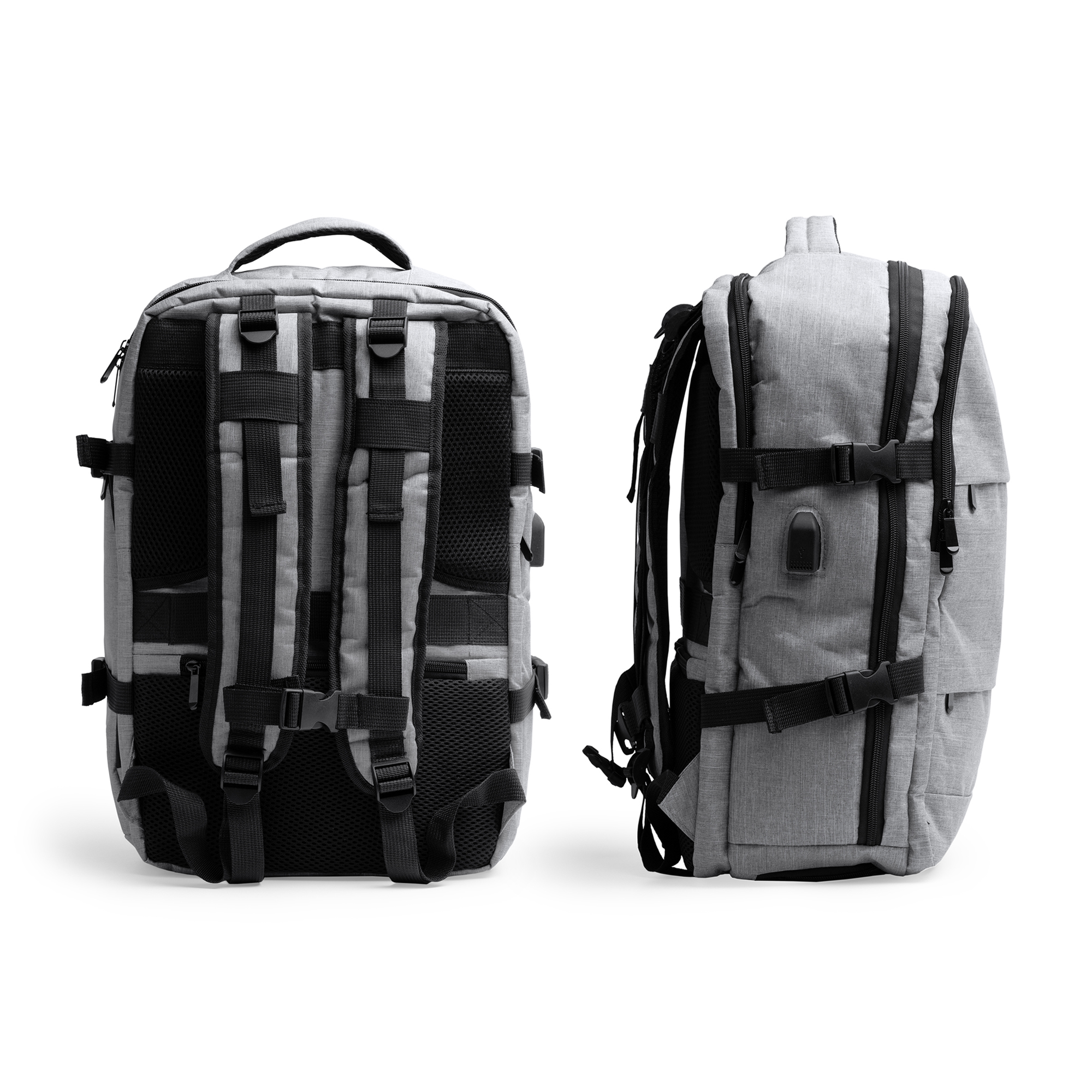 Mochila de viaje realziada en poliéster reciclado RPET, diseñada para comodidad y funcionalidad. Cuenta con espalda y asas acolchadas, 2 bolsillos exteriores frontales y 3 amplios compartimentos principales. Incluye un compartimento acolchado para portátil de 17,3″, salida USB con cable micro USB para conectar un Power Bank (no incluido), y un compartimento transpirable para zapatillas. Con bolsillo antirrobo en la parte trasera y cinta para trolley, ofrece una capacidad de 30 litros para viajes organizados y seguros.