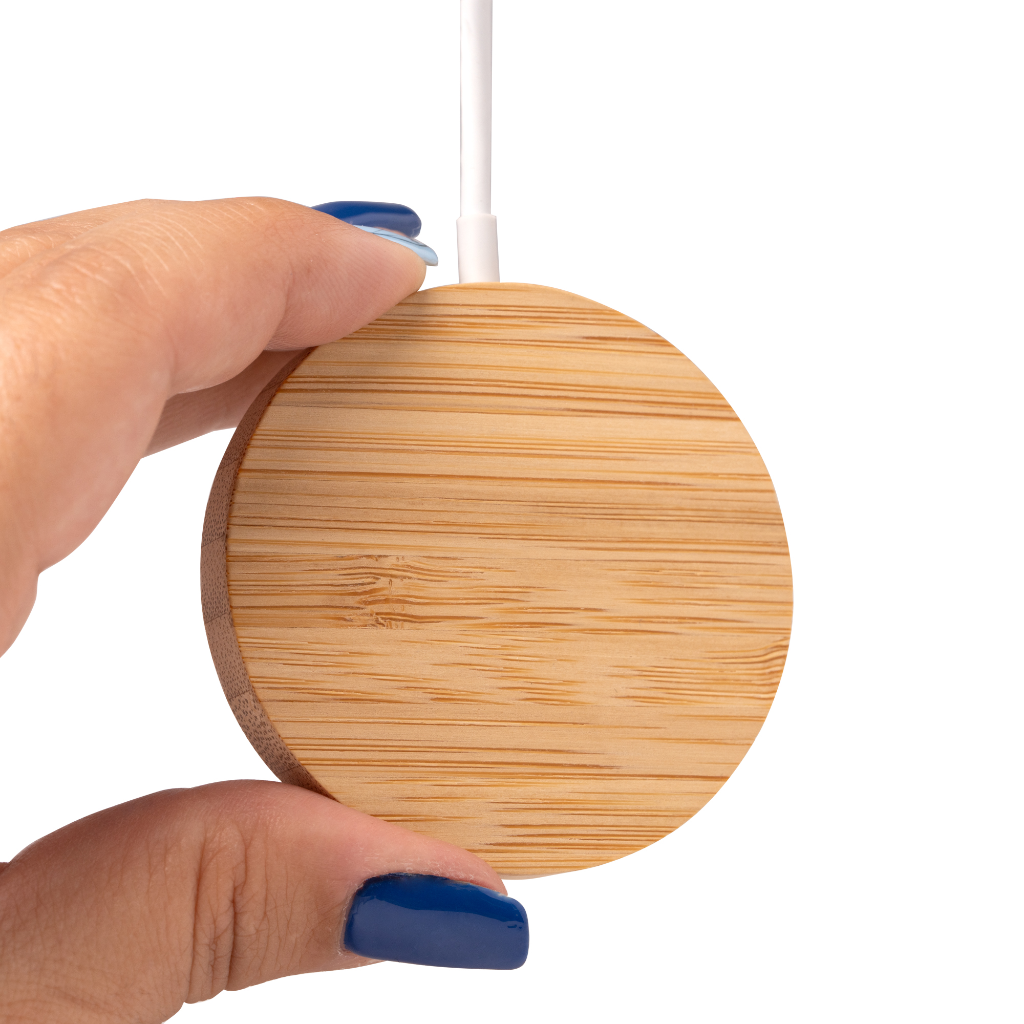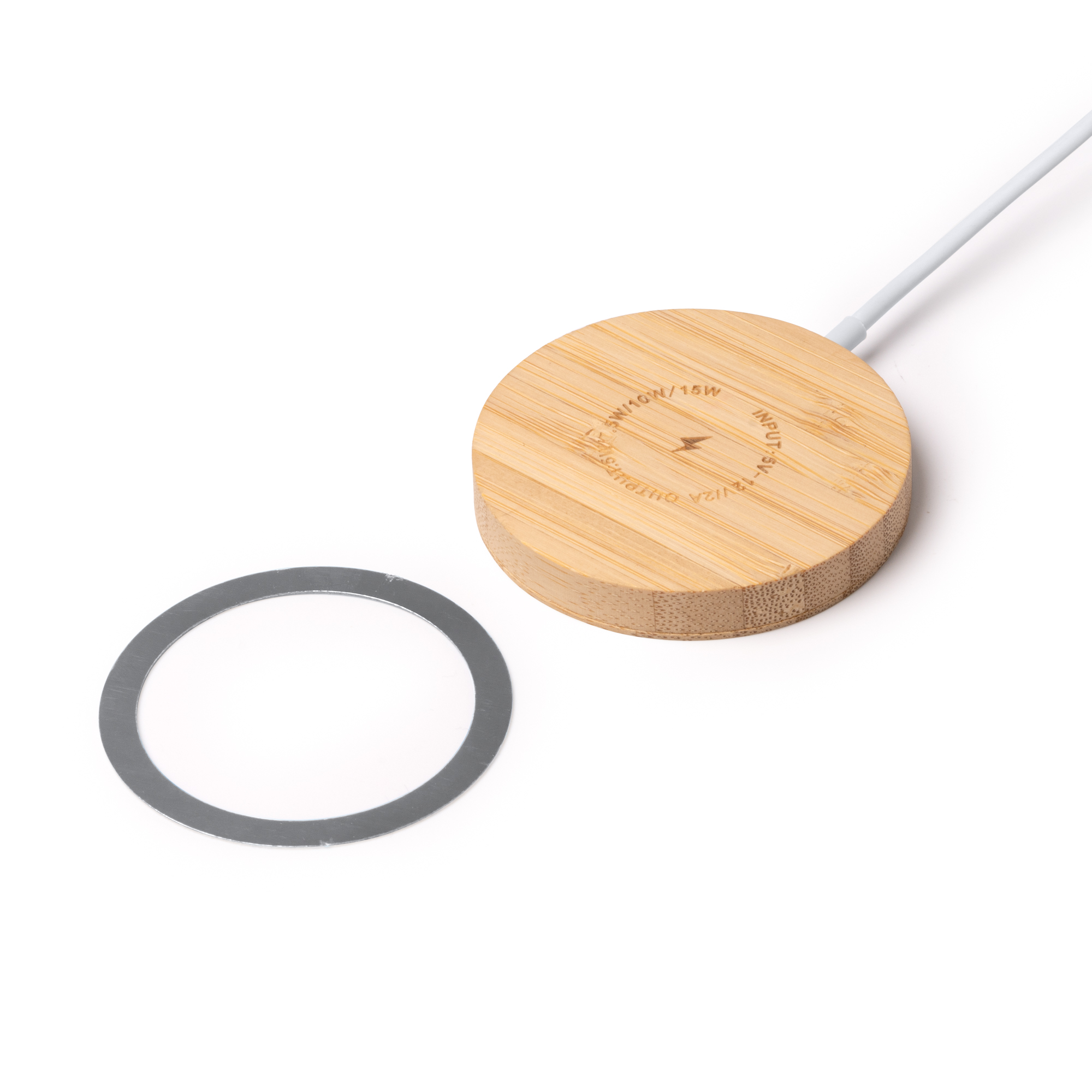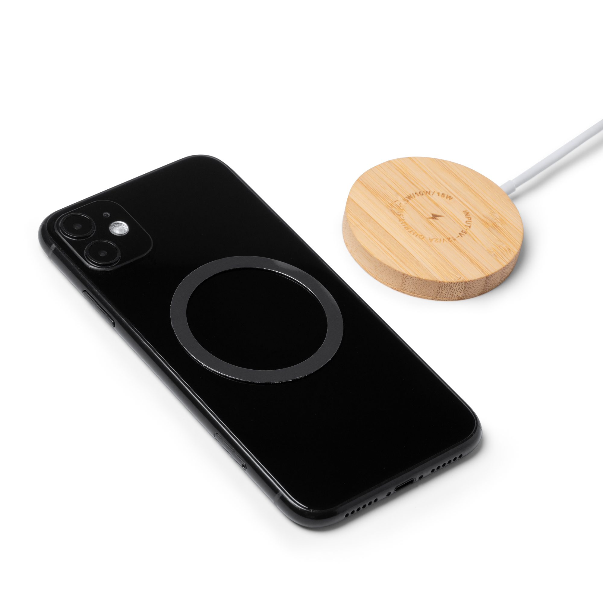Cargador inalámbrico elaborado en bambú. Con función magnética en superficie mediante anillo magnético. Potencia de carga de 15W. Compatible con dispositivos provistos de tecnología de carga inalámbrica. Incluye anillo accesorio adhesivo.