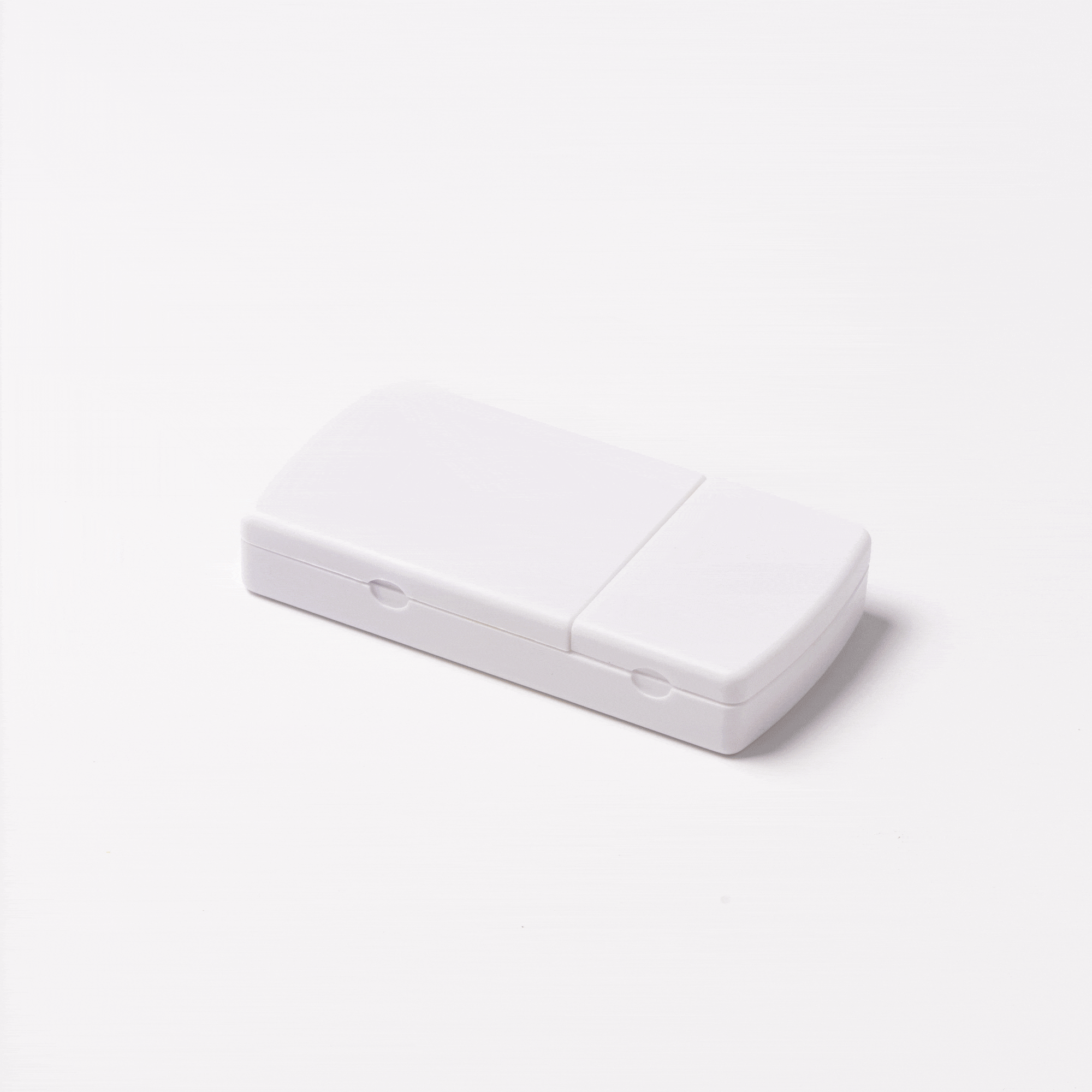Pastillero con dos secciones: una con dos cajitas de dos colores y otra con un cortador para partir comprimidos de mayor volumen.