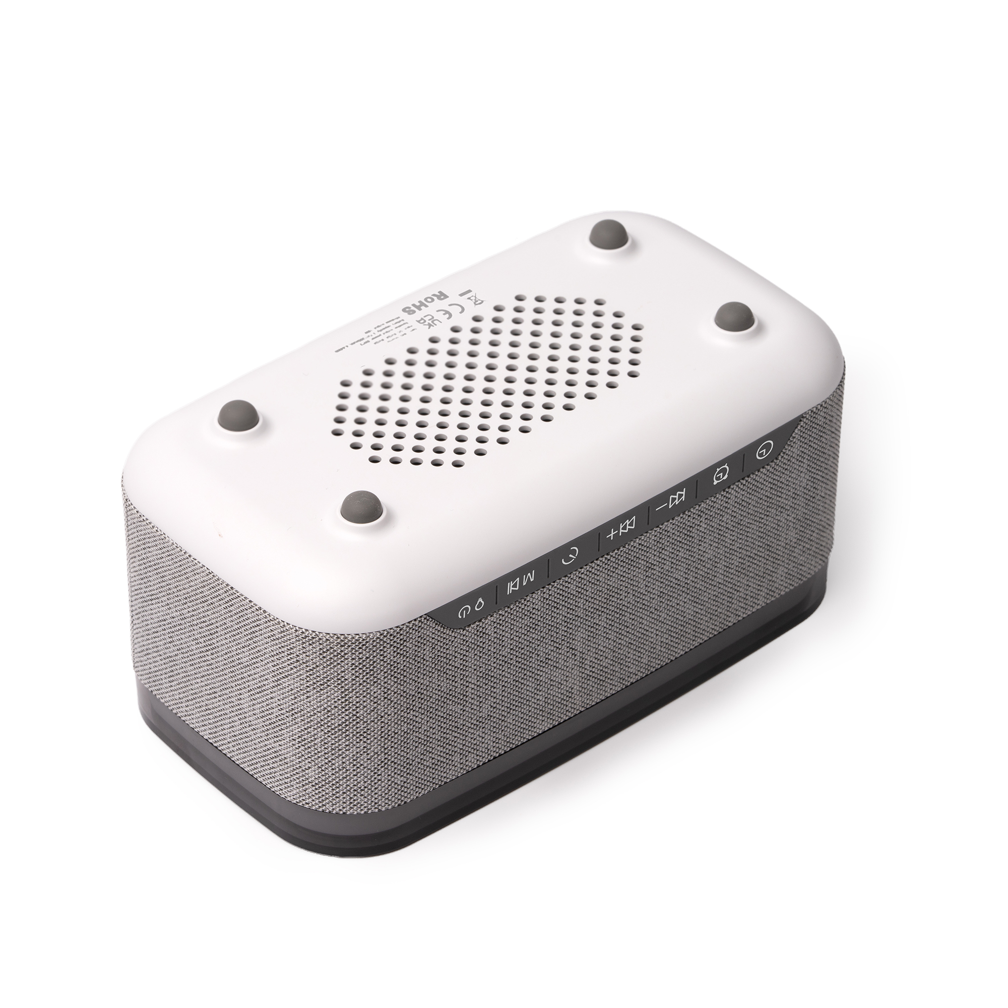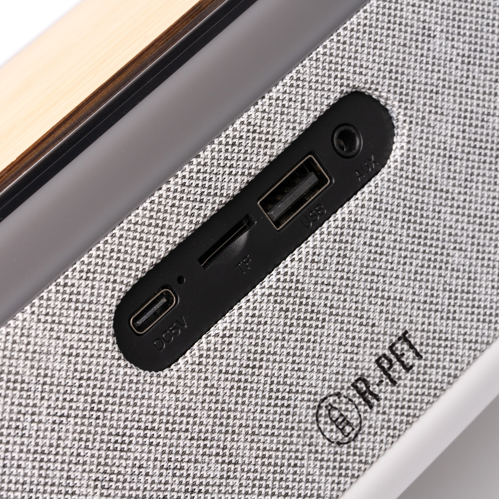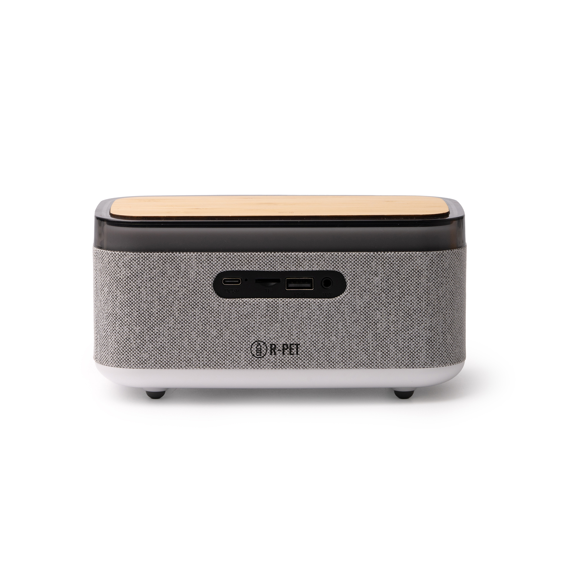 Altavoz inalámbrico con cuerpo elaborado en bambú y tejido reciclado RPET. Cuenta con diferentes funciones: despertador, lámpara y reloj, mostrándose este en su frontal. Incluye diferentes modos de iluminación alrededor de su perímetro. Base de carga inalámbrica para smartphone de 10W. Distintos modos de reproducción: conexión Bluetooh, sonidos relajantes y modo radio FM. Además, cuenta con entradas Tipo C, USB, entrada sonido auxiliar y entrada para tarjeta de memoria.
