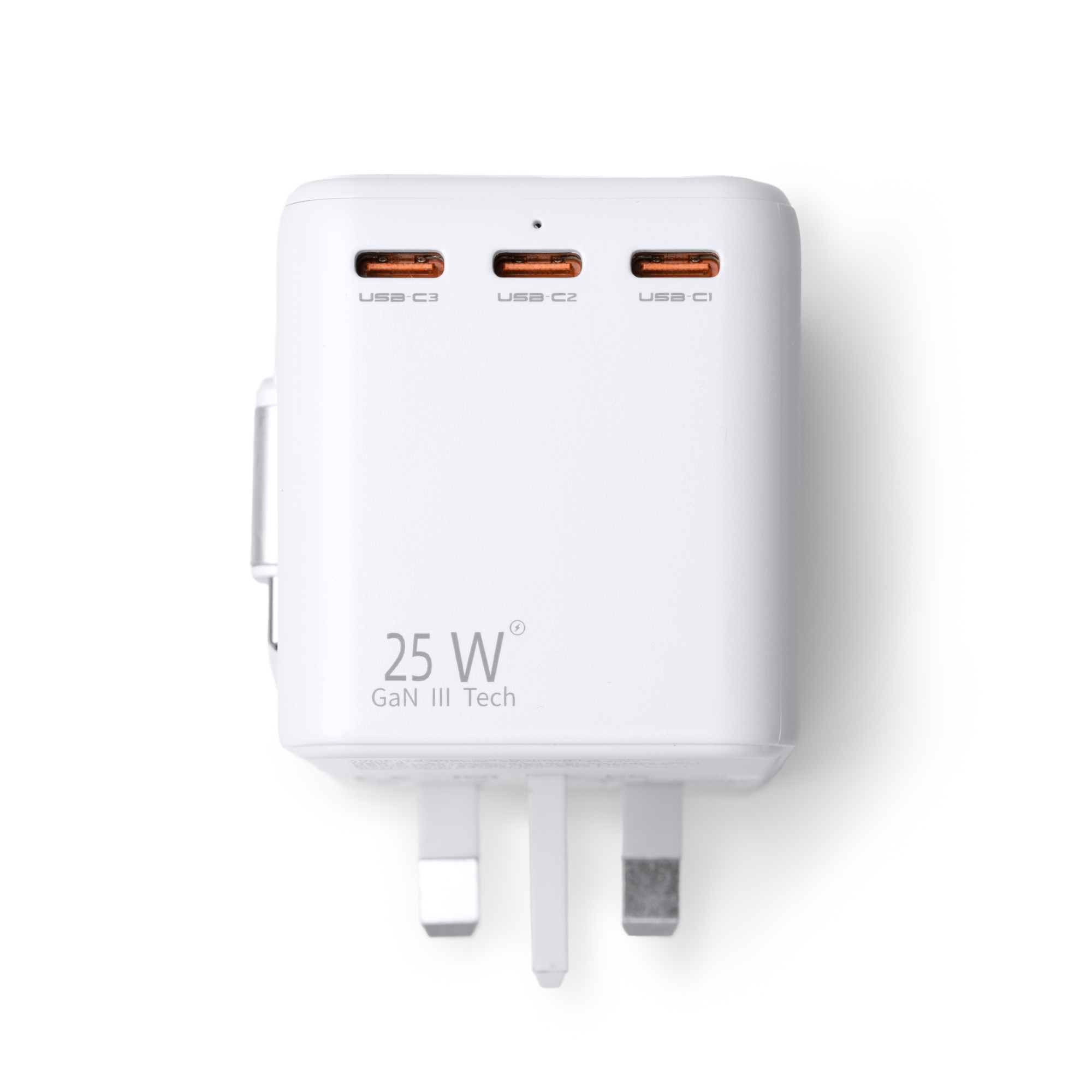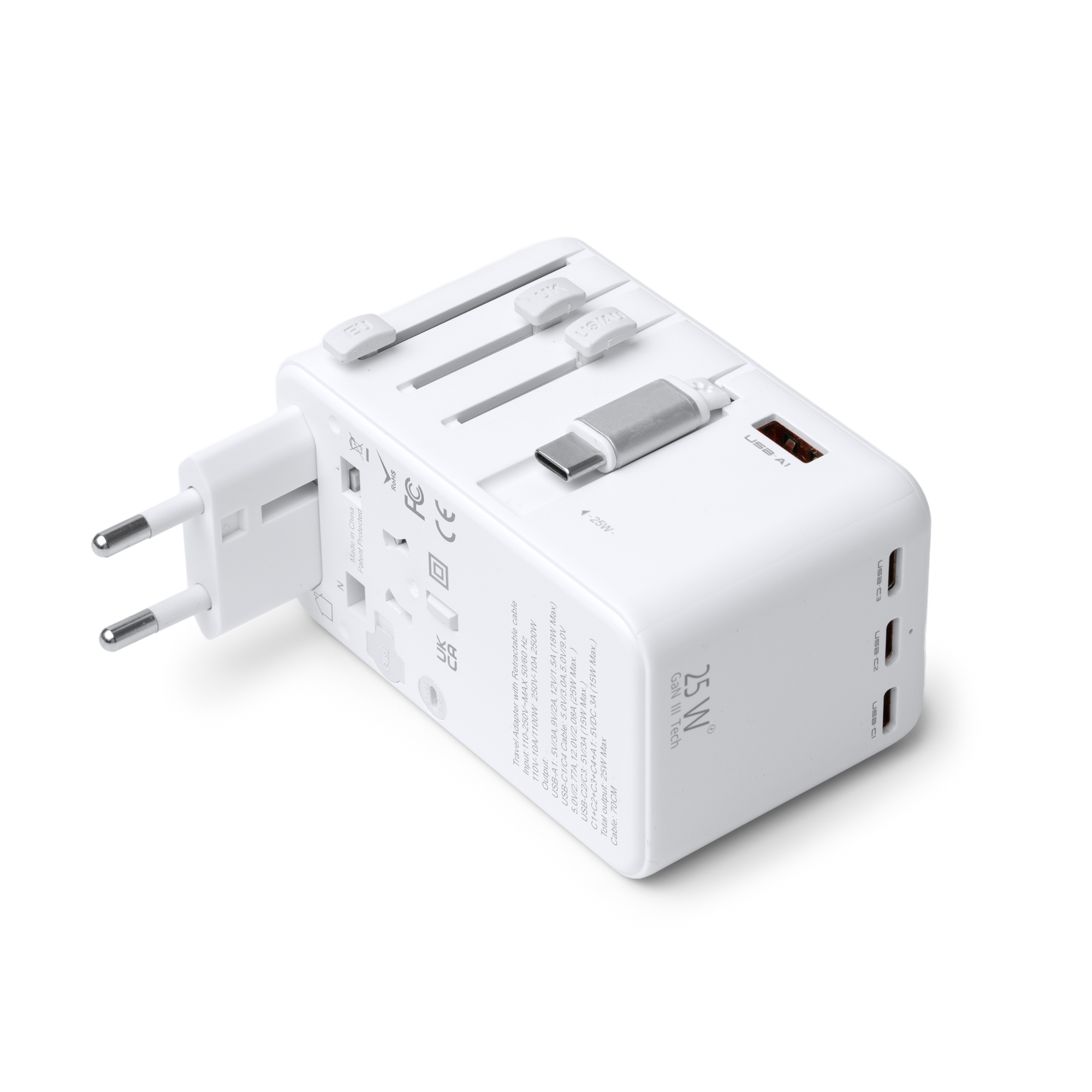 Adaptador de enchufes para viajes elaborado en policarbonato de alta calidad. Cuenta con una potencia máxima de 25W para carga rápida con cables aptos para ello, una salida USB y tres salidas Tipo C. Válido para usarse en Europa, Reino Unido, Estados Unidos, Asia y Australia. Además cuenta con cable de conexión Tipo C retráctil.