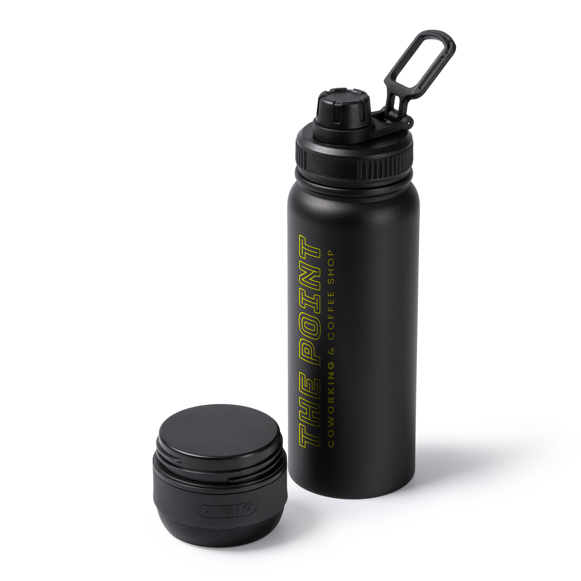 Bidón térmico de acero inoxidable 304 de doble pared con altavoz Bluetooth extraíble en la base. Capacidad del bidón de 650 ml. Tapa con asa de transporte retraíble. Altavoz con 3W de potencia, con batería de litio recargable. Cuenta con botones multifunción de control de reproducción.