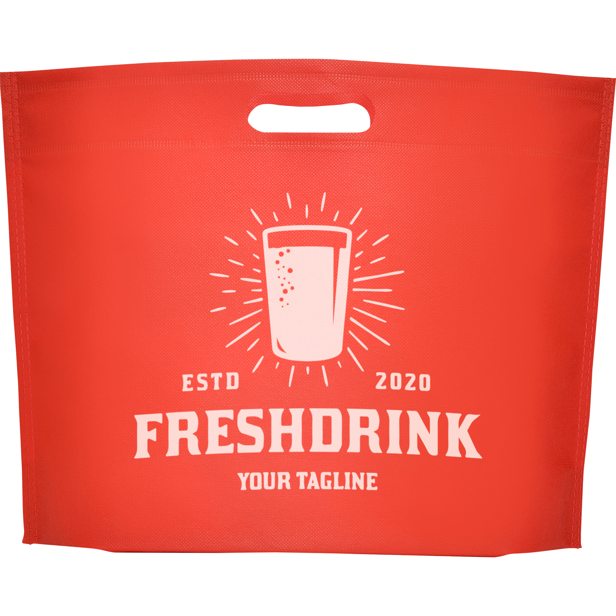 Bolsa termosellada con fuelle en la base, fabricada en tejido non-woven (no tejido), con el asa troquelada. Resistencia hasta 6kg de peso.