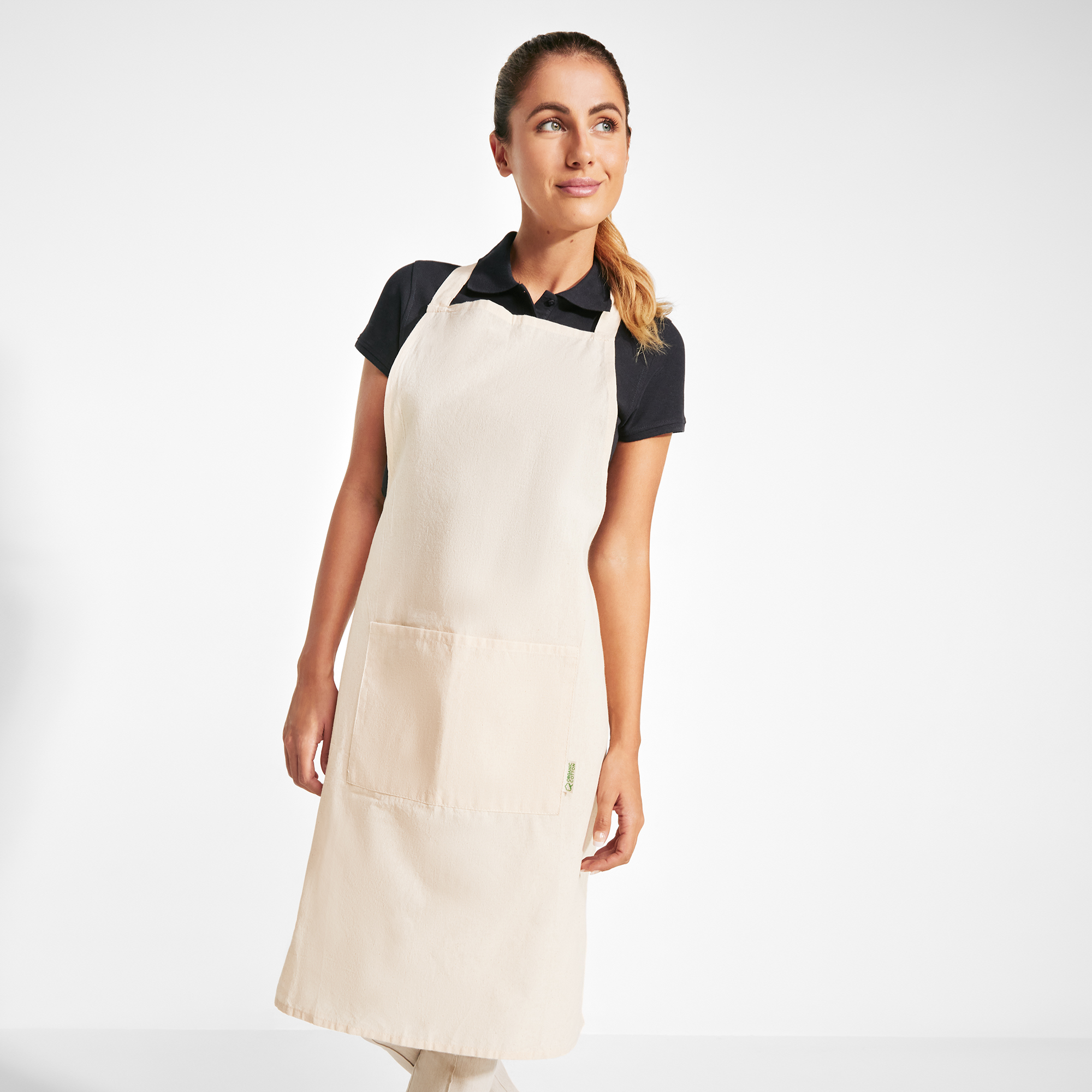Delantal 100% algodón orgánico con bolsillo frontal.