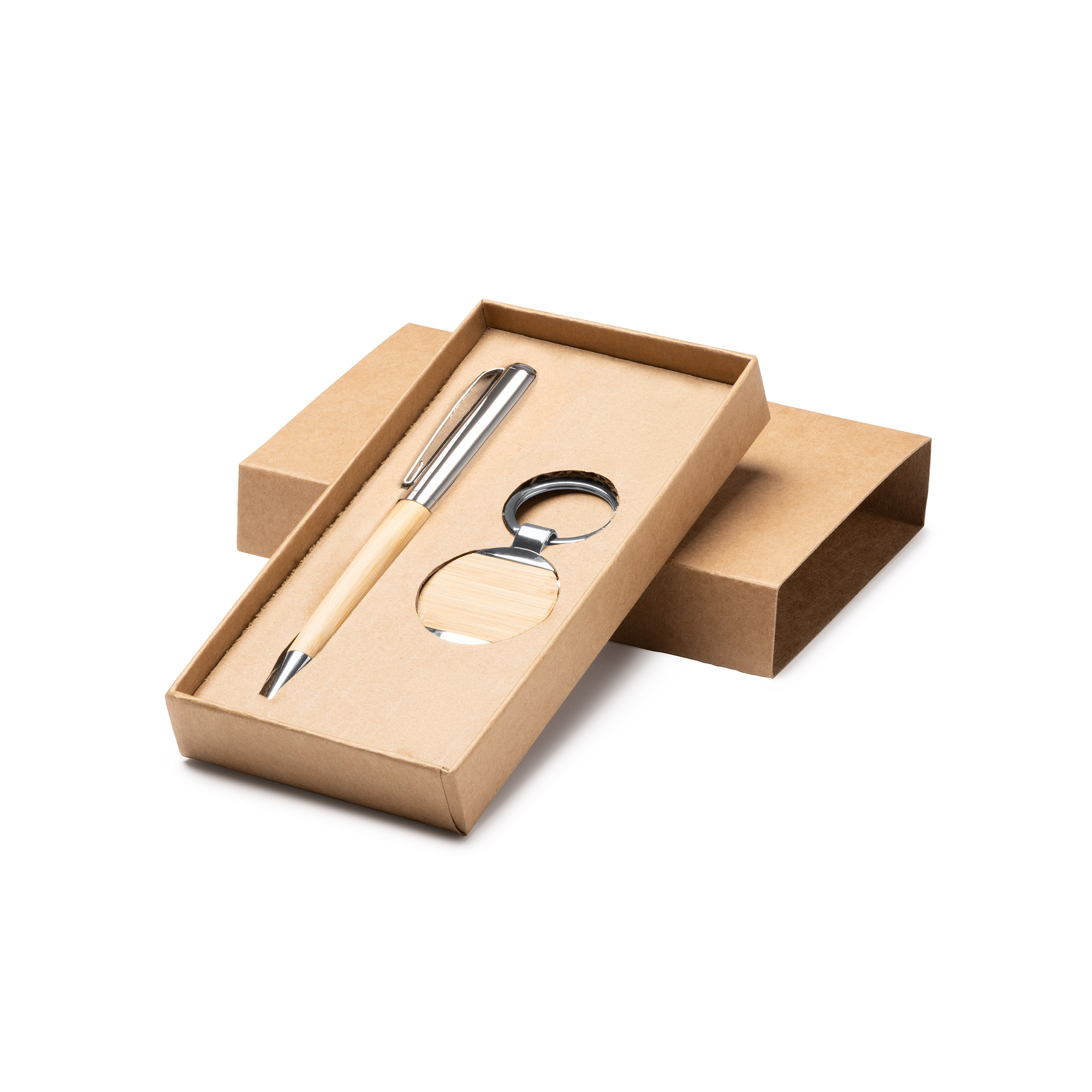 Set de bolígrafo y llavero de bambú con detalles metálicos. Tinta azul.